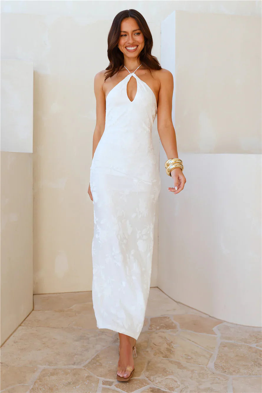 For all the exclusive girls. The Sale-Dress Admired From All Angles Halter Maxi Dress features an elastic back and a halterneck tie-up design. Simply gorgeous styled with heels and curls for all the attention.