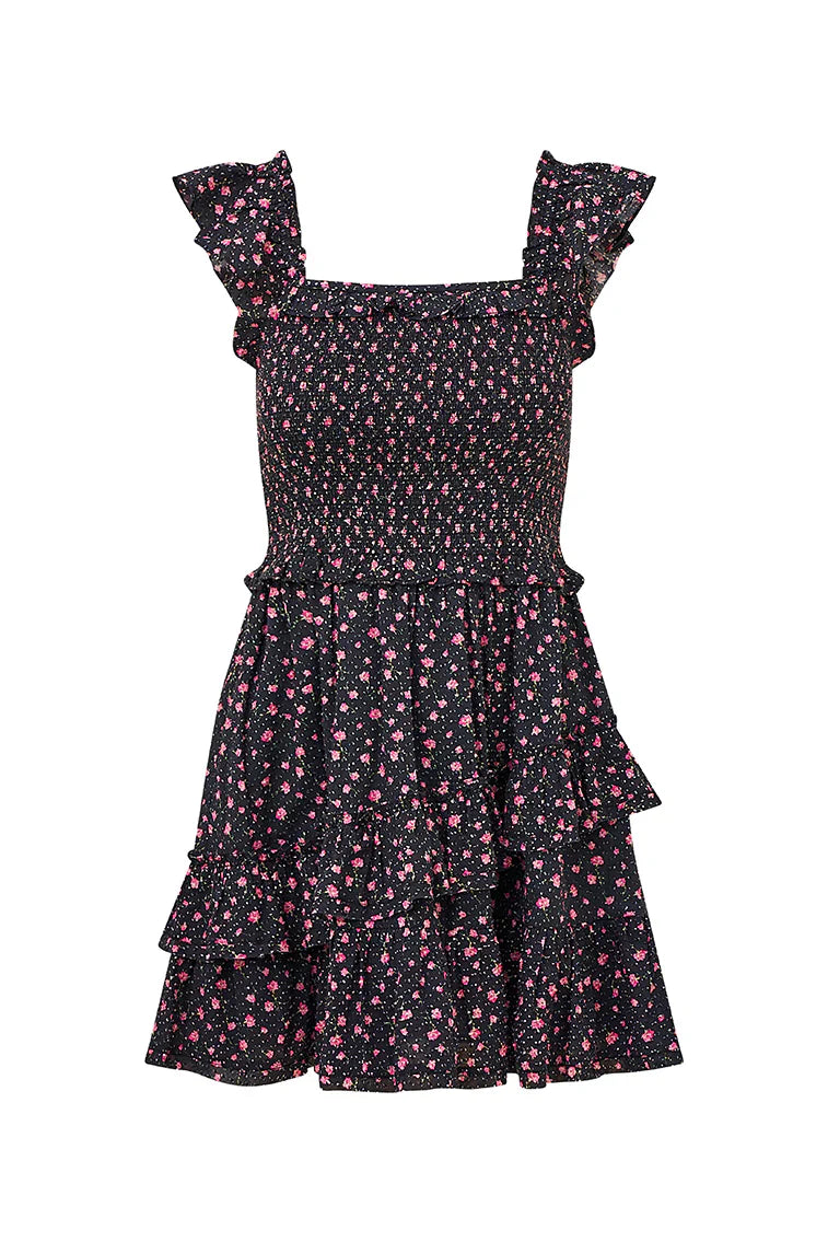 We’re all in on the Aline Dress. This playful mini is crafted from a high-quality viscose fabric and features a luxurious micro twist dot texture adding a touch of subtle sophistication. Flirty ditsy rosetted printed all over give this piece charming and whimsical detail. The dress begins with short flutter sleeves that descend to a square neckline above a smocked bodice with a tiny ruffle flounce falling to any airy ruffle-tiered skirt.