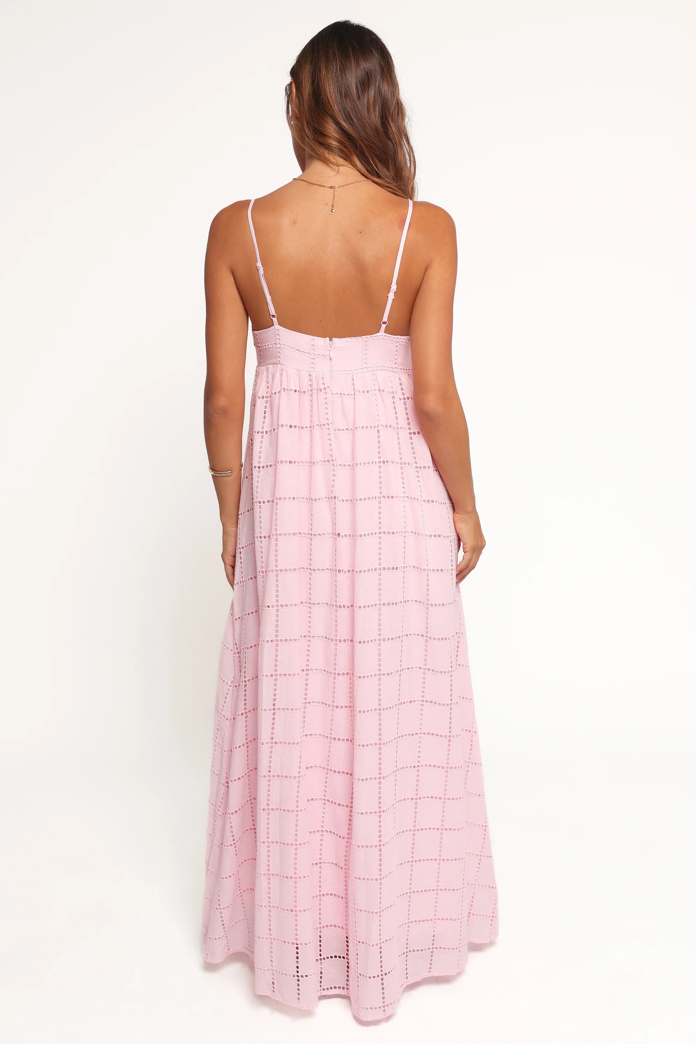 DETAILS Crafted from luxurious embroidery anglaise material, the Alyah Maxi Dress in Pale Pink is designed to make you feel effortlessly chic. Its maxi length offers a graceful silhouette, perfect for both daytime outings and evenings out.