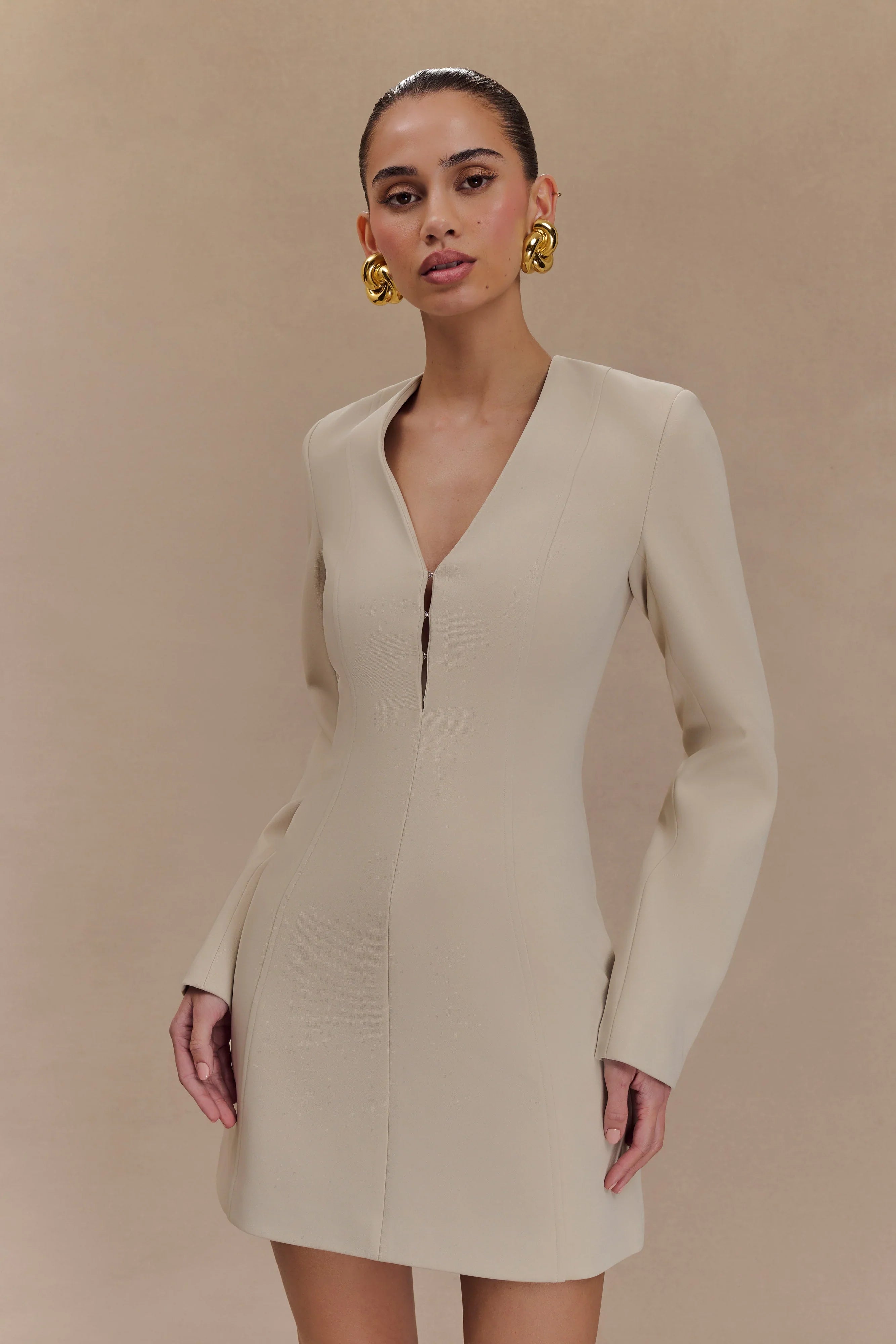 The ARORA Suiting Blazer Dress with Pleating effortlessly blends sophistication and modern style. Its flattering V neckline, complemented by a chic hook & eye neck detail, creates an elegant look that’s perfect for any occasion. Structured shoulders enhance the tailored silhouette, while the mini length adds a playful edge. The centre back zip ensures a sleek fit, and the fully lined interior provides comfort and quality. Whether dressed up or down, this dress is a versatile statement piece that captures power and femininity in one stunning design.