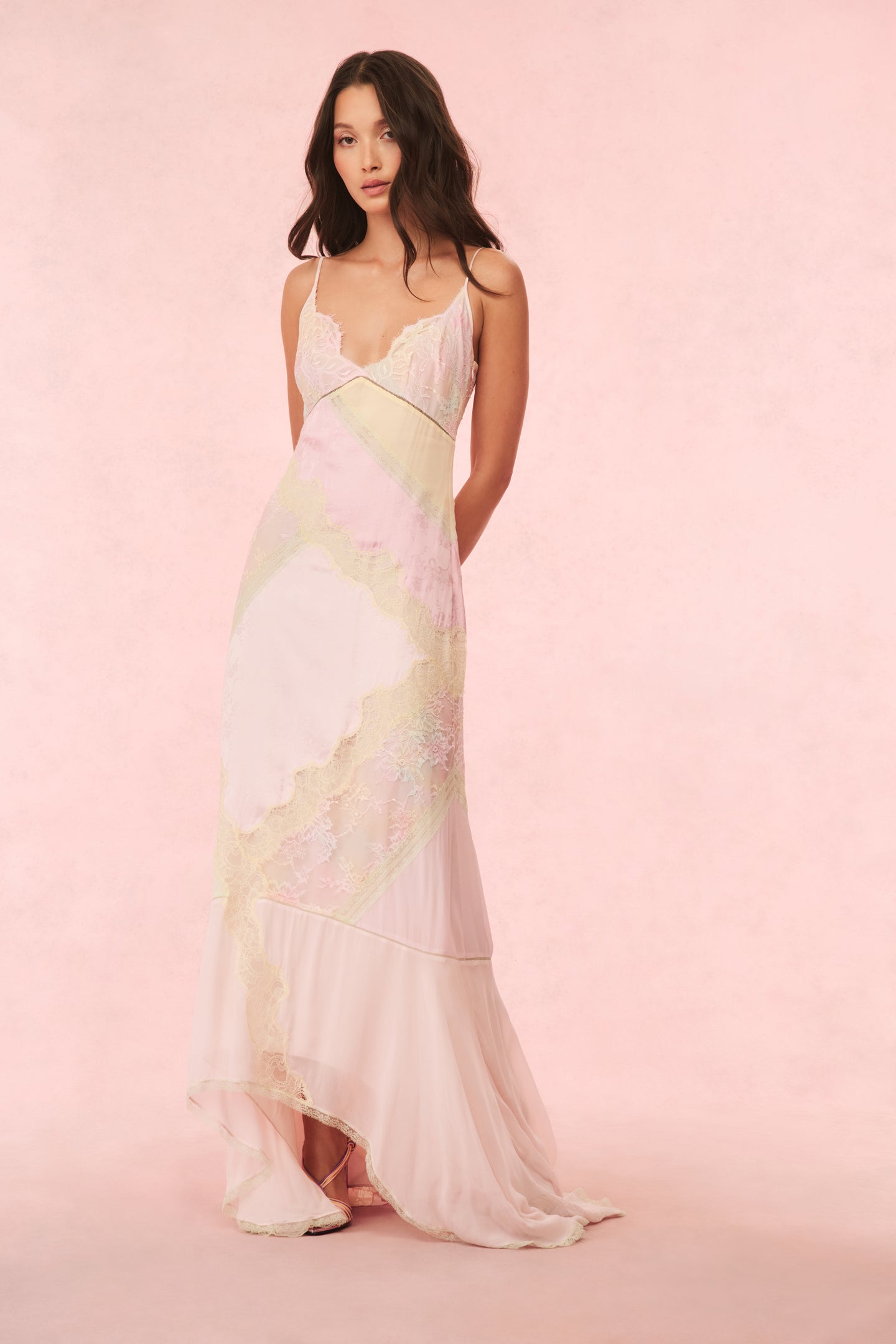 Introducing the Bancila Dress. Inspired by the early aughts red carpet fashion, this stunning party dress arrives with an intricacy of details like patchwork printed tie-dyed laces, jacquard, chiffon panelings, and delicate lace trims. This flirty, slip dress features scallop lace at the neckline, thin spaghetti straps, and a bias cut giving it a natural stretch. With a mermaid shape and high-to-low silhouette, the piece is finished with a chiffon flounce at the bottom, a triangular cut out at the back for added sexiness, and functional ties at the back. A zipper is included for functionality.
