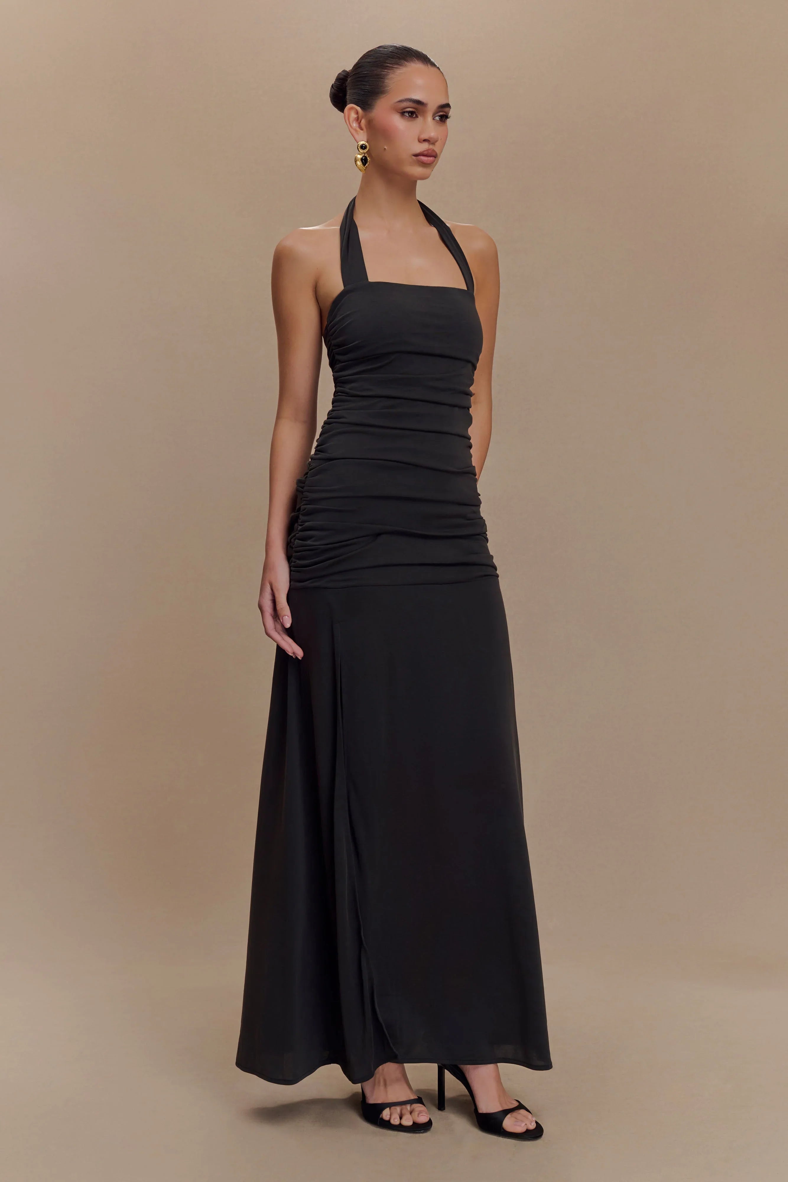 The BENTLEY Peached Jersey Halter Maxi Dress combines modern elegance with a flattering silhouette. Featuring a halter neckline and a ruched bodice that extends to the lower hip, this dress accentuates your figure while providing a comfortable fit. The flared lower skirt adds graceful movement, and the leg split enhances the dress's dramatic effect. Lined for a smooth finish, this dress reaches a maxi length, making it a perfect choice for formal events or elegant evening outings.