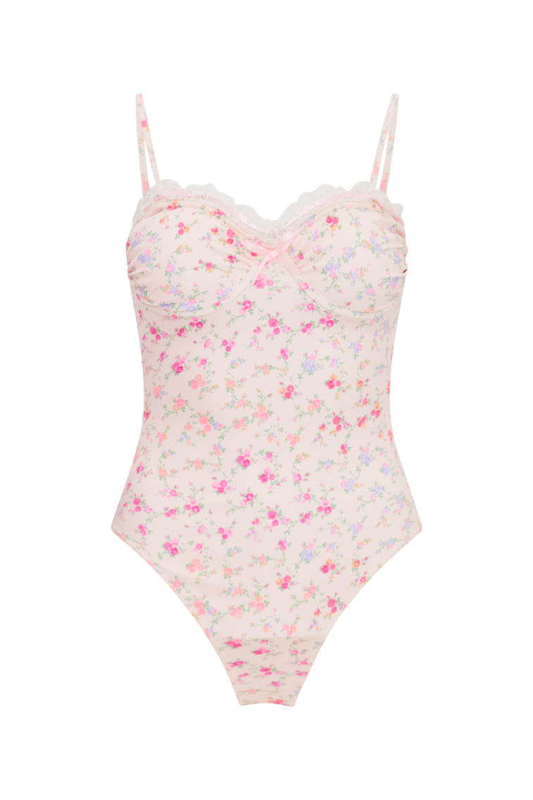 Beachbound in the Brooksie One Piece. This pretty swimsuit suns with our signature print all over. With sweet ruffle detailing, this piece features thin spaghetti straps, ruched detailing at the bust cups and a form fitting silhouette.