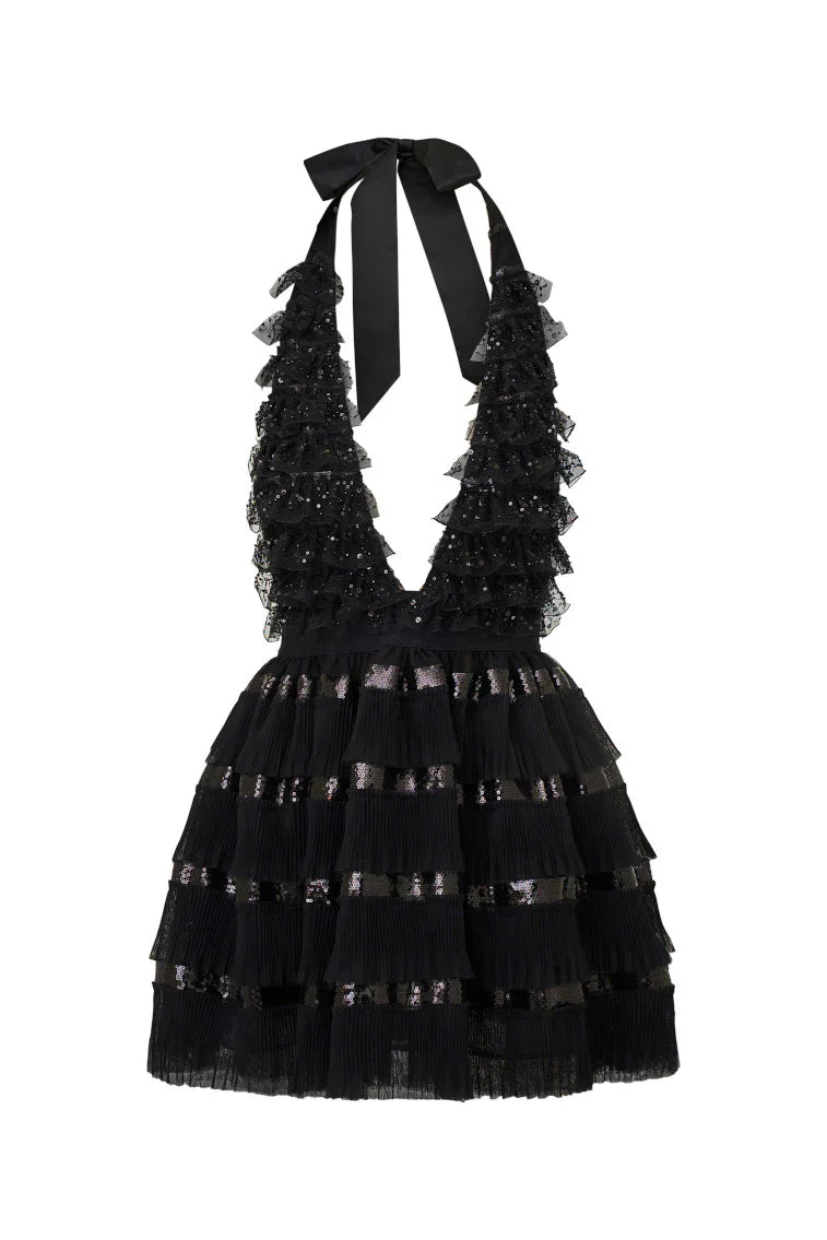 Meet the party dress of our dreams, the Callaia Dress. This 80s-inspired mini dress is all in the details with a stunning sequin-adorned tulle fabric featuring micro pleats on the skirt for a playful texture. As chic as it is flattering, the dress begins with a self-adjustable halter top sitting above an elasticated waist that falls to a flirty, ruffled bodice and skirt with shimmering lurex dots all over. She’s the ultimate birthday, date night, girls night out dress.