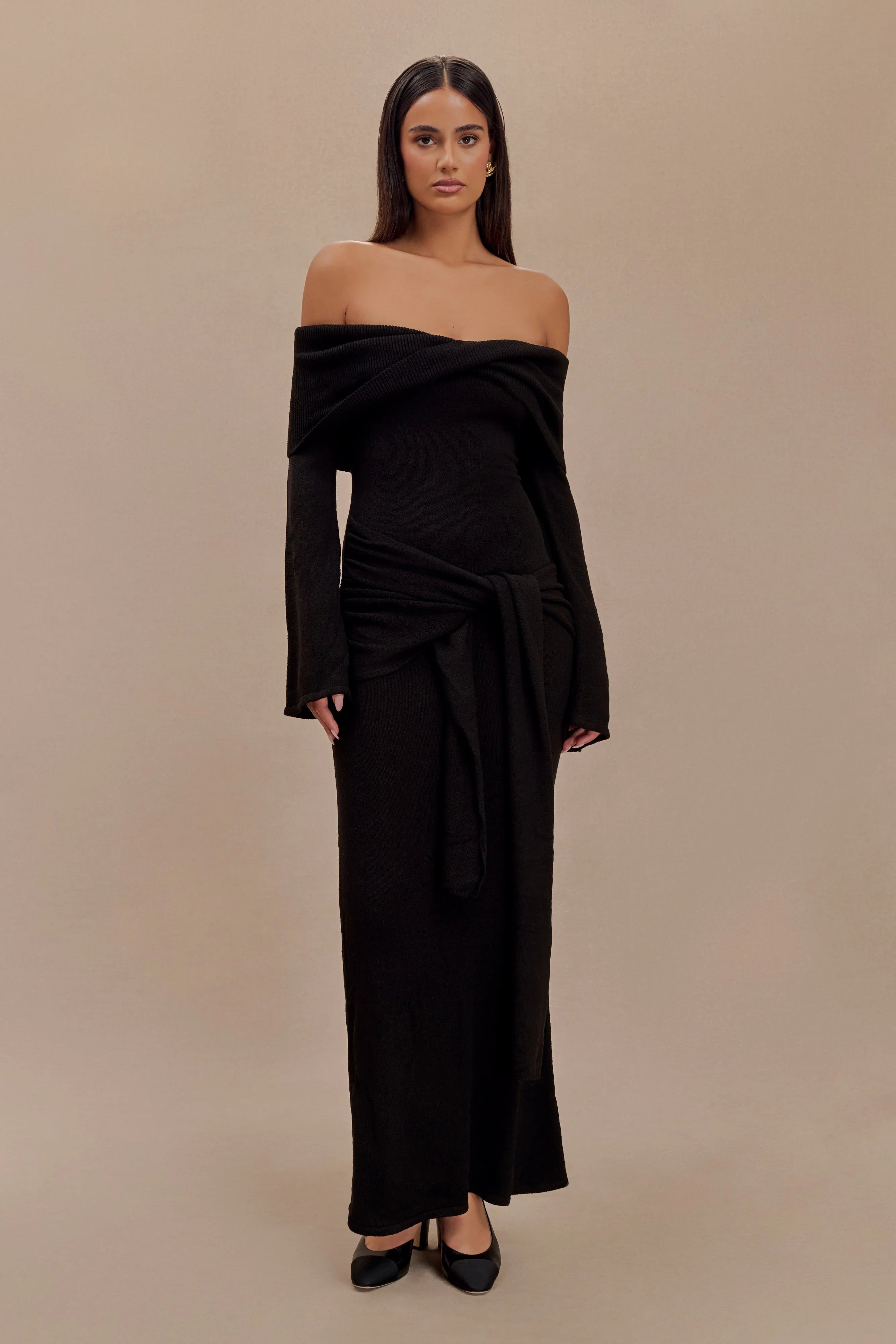 The CAMERON Off Shoulder Tie Maxi Dress is designed to make a statement with its off-the-shoulder neckline and sophisticated twist front overlay. Long sleeves and a bodycon silhouette sculpt the figure, flowing into a striking fishtail hem for added drama. The maxi length is complemented by a delicate tie detail at the hip, creating a refined yet effortless finish. Unlined in a soft knit, Cameron offers a seamless blend of luxury and comfort, perfect for your most elevated occasions.