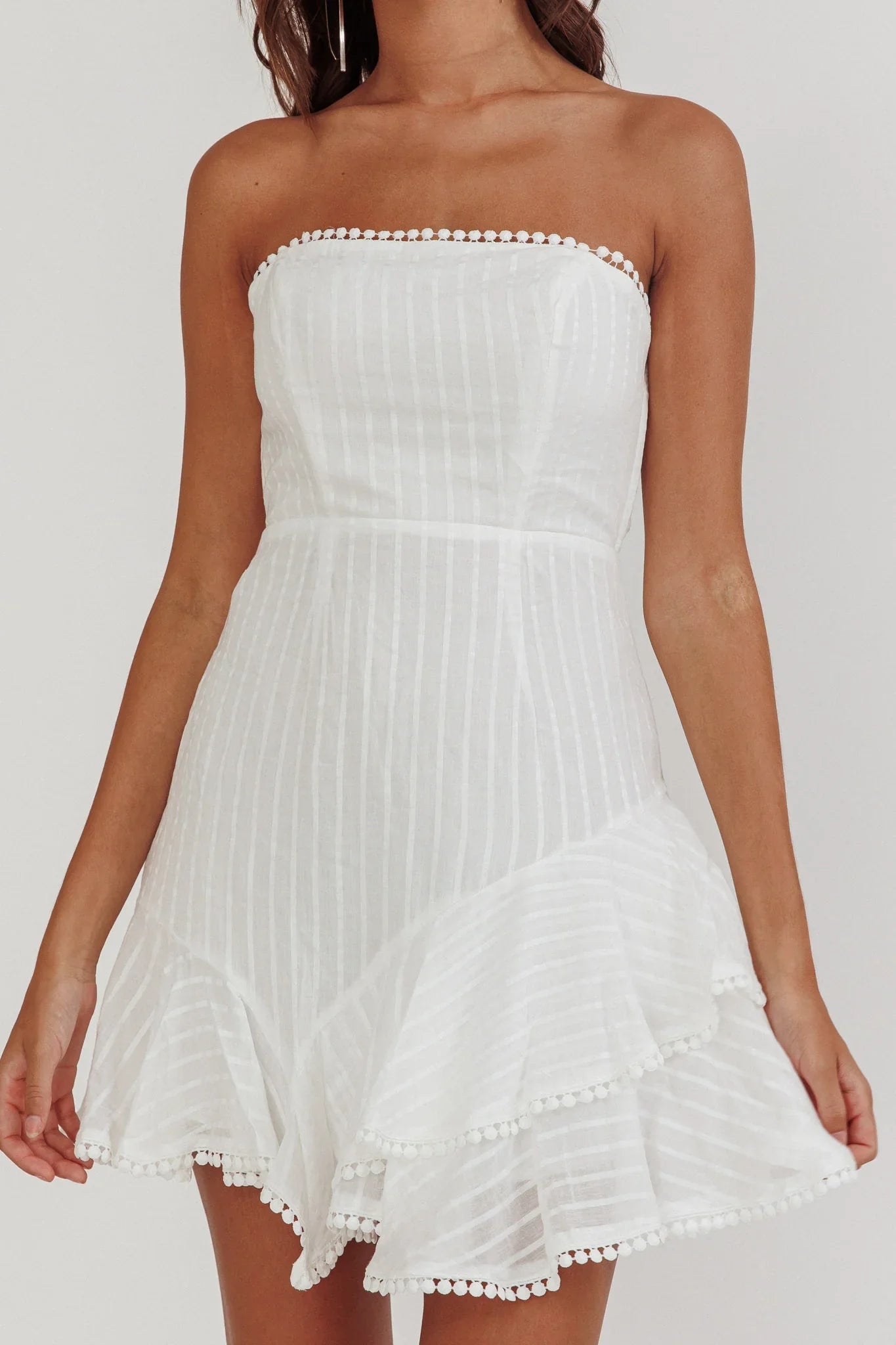 Make an entrance in our super sweet Candy dress. Featuring a strapless design with boning in the bodice, gorgeous lace trim and tie-up back. It'll make the perfect party dress teamed with statement earrings and strappy heels.