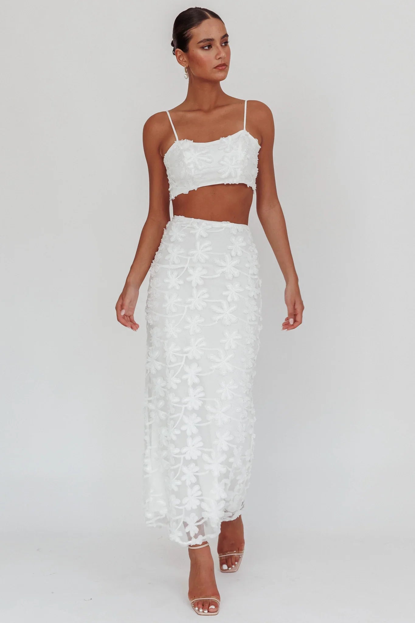 Make your grand entrance in our super chic Casi skirt. It features embroidered palm trees throughout and a maxi length. It's perfect for a bridal shower or a special event. Team it with its matching crop top and strappy, nude heels for a look that will have you flooded with compliments.
