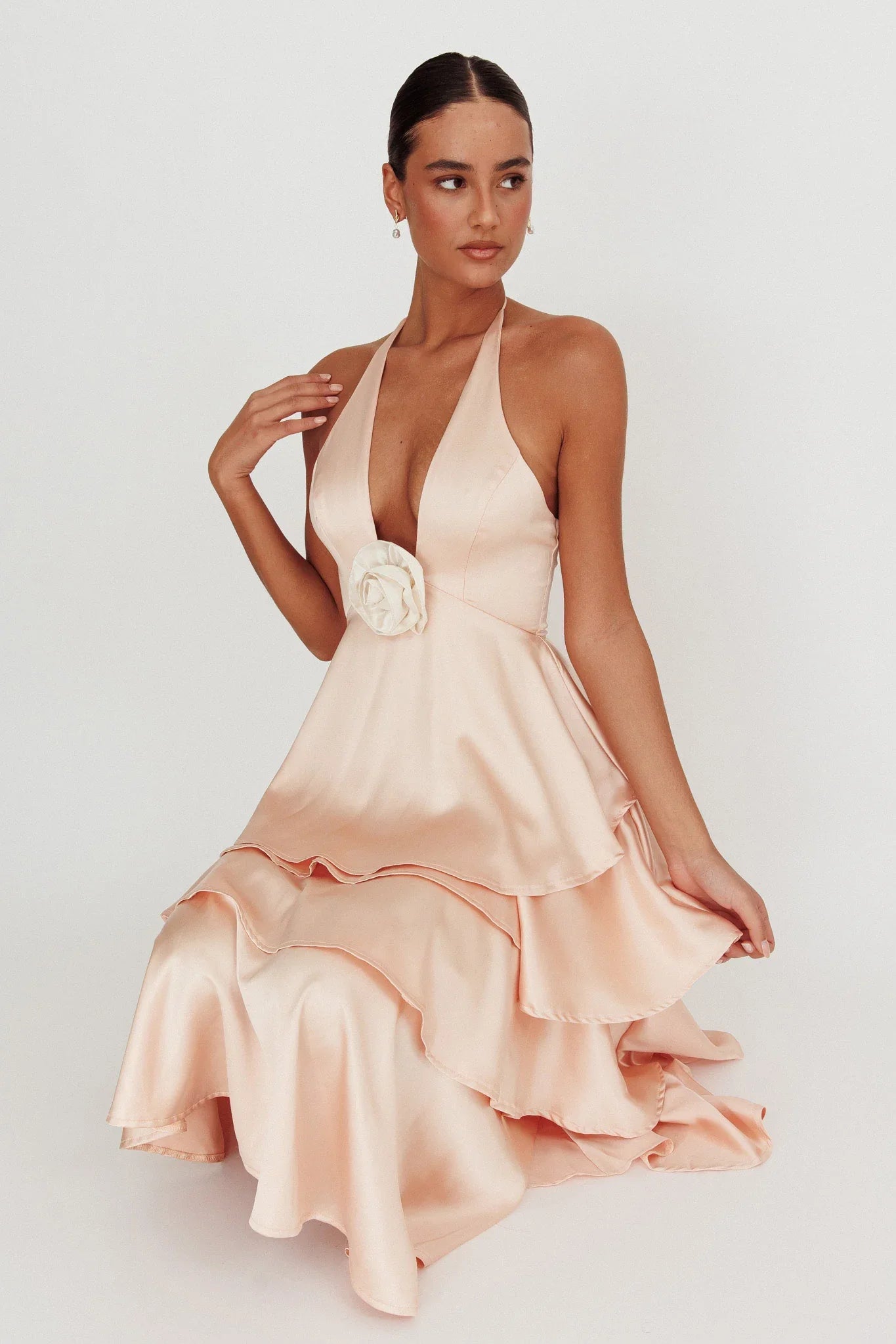 Heads will turn when you float by in our gorgeous Catalina maxi dress. We are obsessed with its tiered ruffle design and contrast rosette. Perfect for a date night or birthday party. Team it with strappy heels and a tote for an unforgettable look.