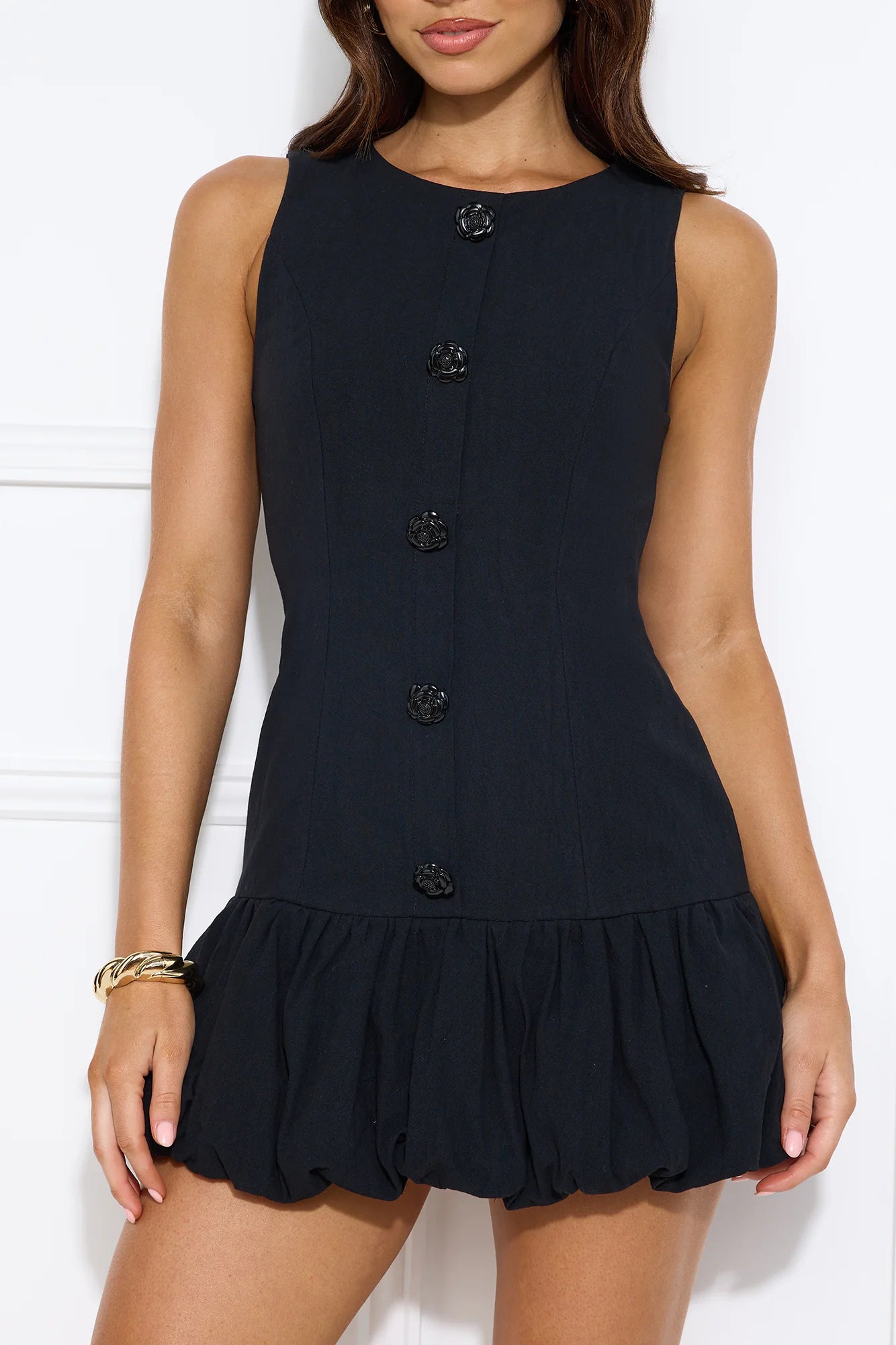 Make a stylish statement in the Crystal Lights Bubble Mini Dress. Featuring a bubble hem and a faux button front with gorgeous flower-detailed buttons. Style with heels and curls.