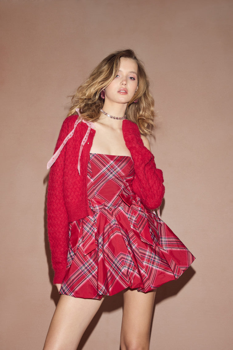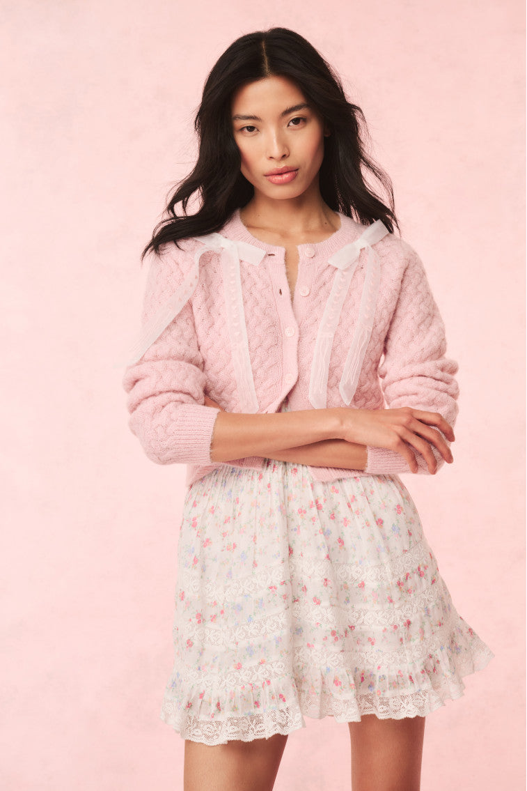 Warm wishes in the Cupid Cardigan. Designed from a warm, alpaca blend this charming cardigan features intricate, basket weave stitch, a slightly cropped fit, and raglan arm holes on the long sleeves. Faux shell buttons line down the center front, while pretty, detachable polyester organza bows are pinned to the top featuring a playful heart and bow embroidery.
