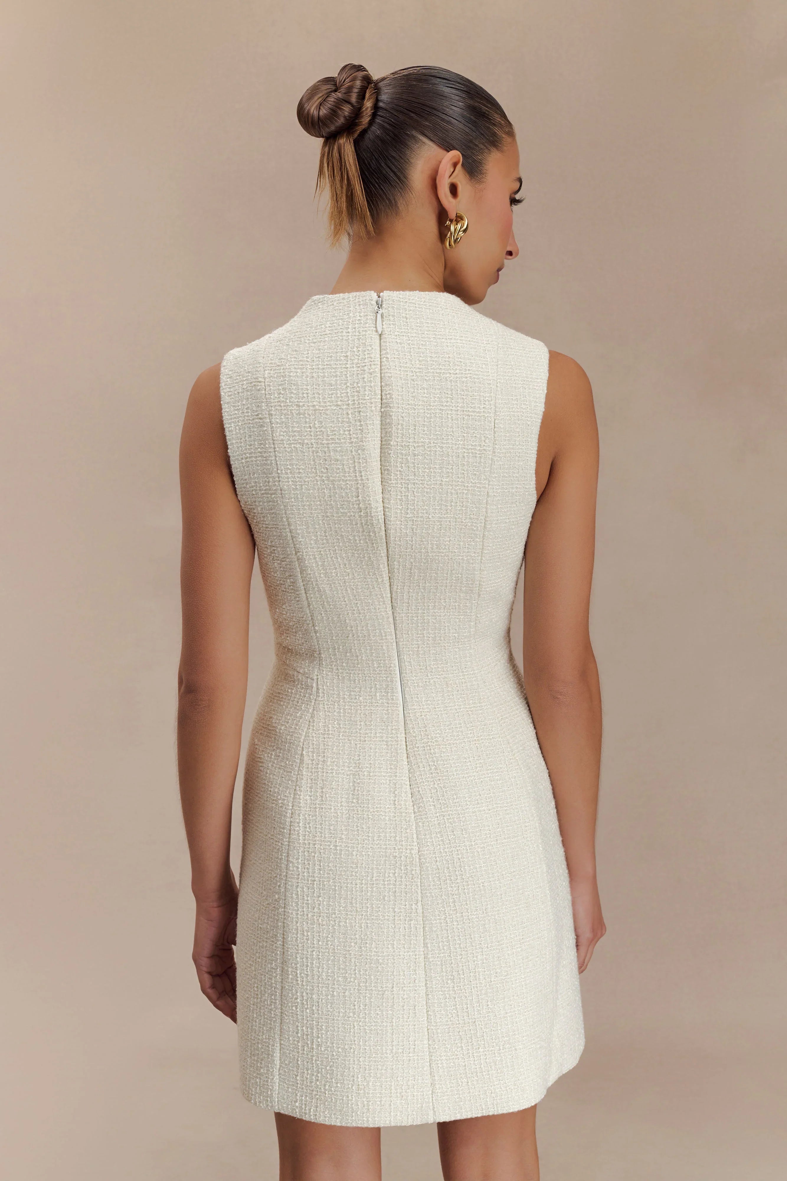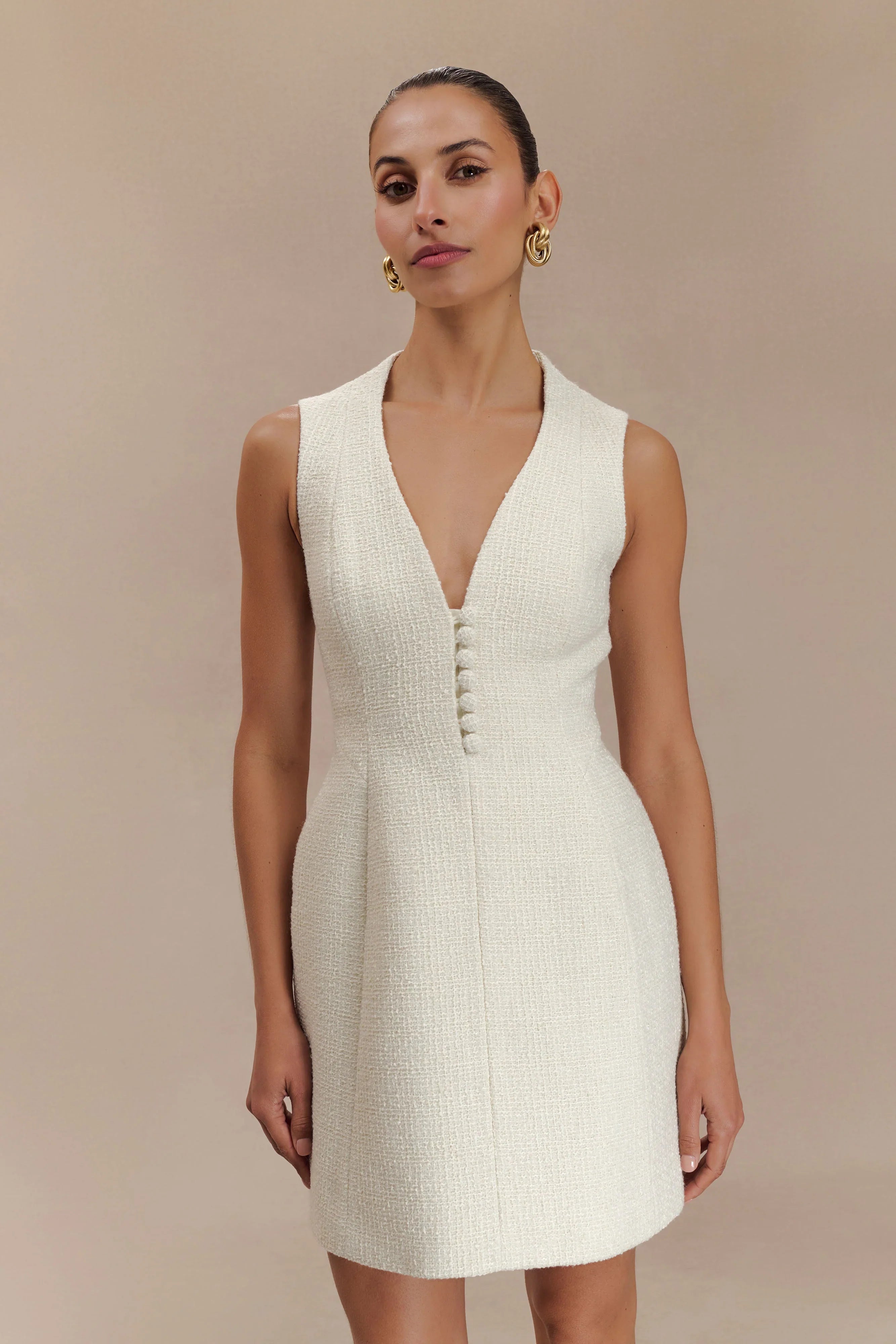 Introducing the DANNA Boucle Mini Dress, a delightful blend of sophistication and fun. This dress features a flattering V neckline and sleeveless design, perfect for showcasing your favourite accessories. The centre front button detail adds a charming touch, while the structured shape provides a tailored fit that enhances your silhouette. The playful bubble shape skirt offers a flirty flair, making it an ideal choice for day or night. Crafted from textured boucle fabrication, this mini dress exudes a stylish vibe, ensuring you stand out in any crowd. With a convenient centre back zip closure for easy wear, this dress is a must-have for your wardrobe.