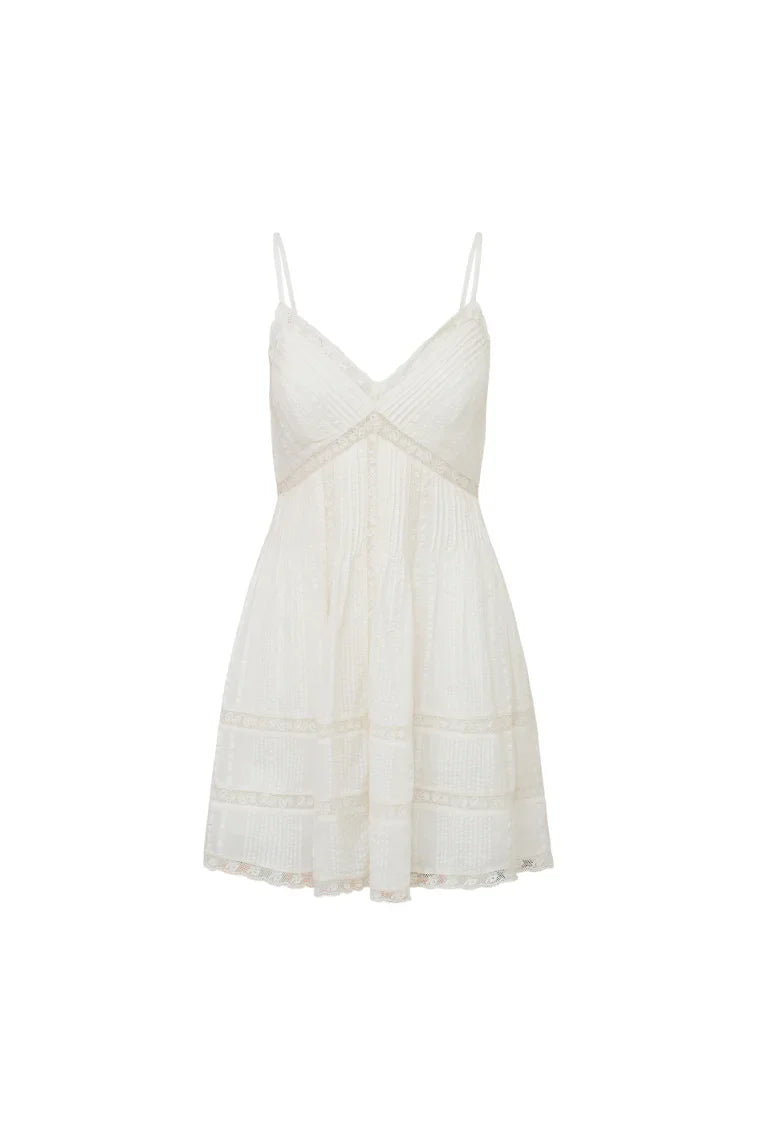 The Docilia Dress returns as part of our Upcycled Icons Collection, a limited-edition, sustainable capsule featuring our best-selling silhouettes made from remnant LoveShackFancy fabrics. Warm weather perfection, this flirty mini dress has a flattering silhouette with lace insets and pintucking details. The dress features a smocked back, spaghetti straps, and an airy skirt finished with lace.