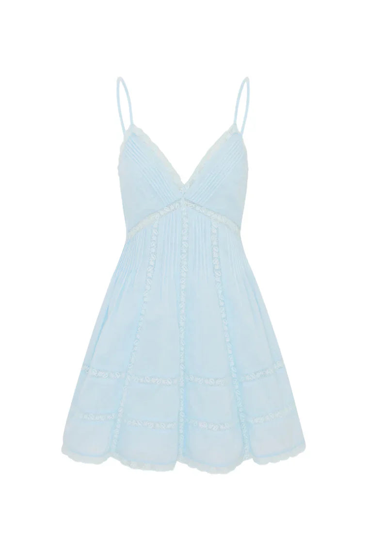 Our Docila Dress is a flirty mini designed with a flattering silhouette with lace insets and pintucking details. The dress features a smocked back, spaghetti straps, and an airy skirt finished with lace.