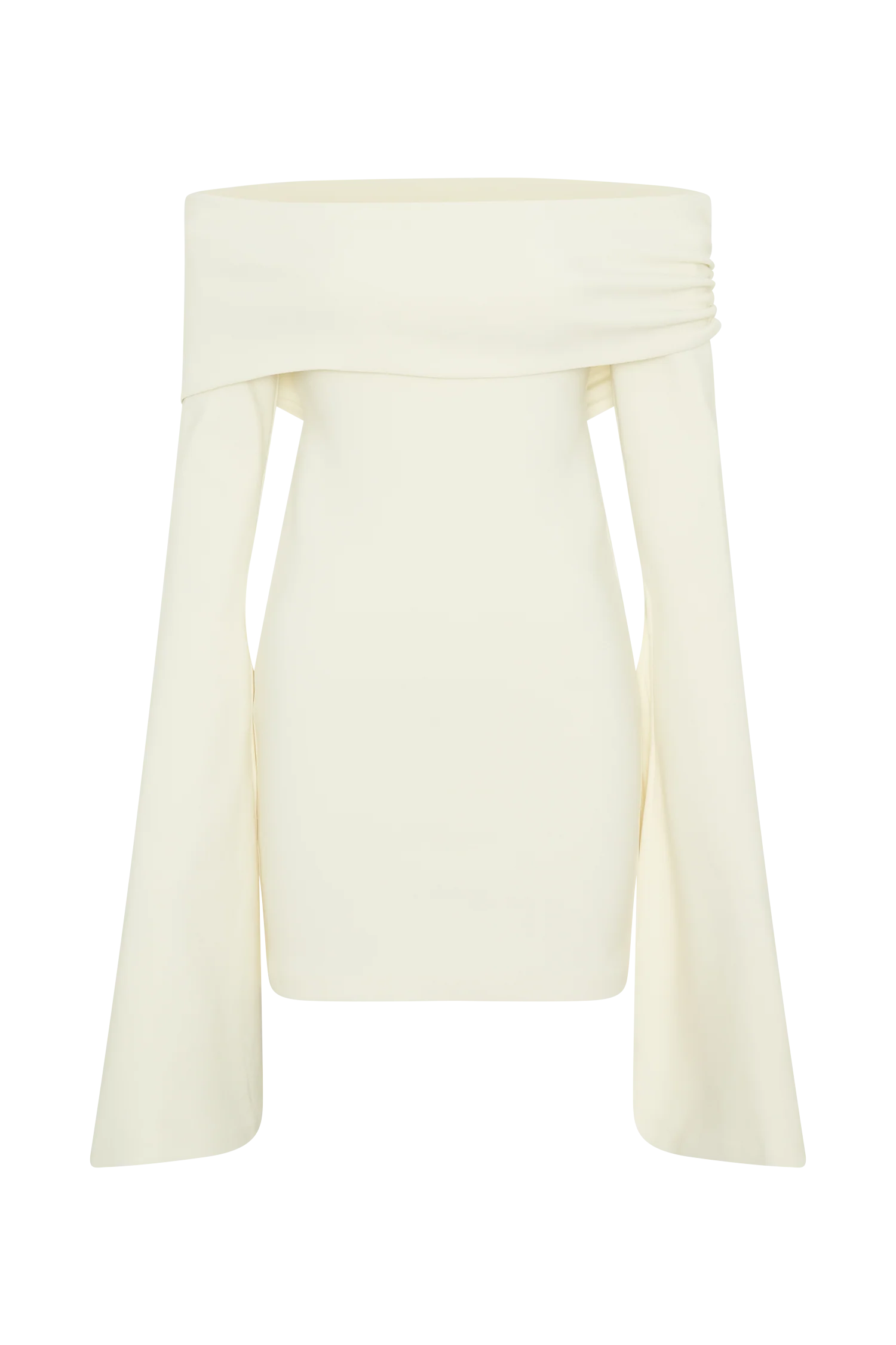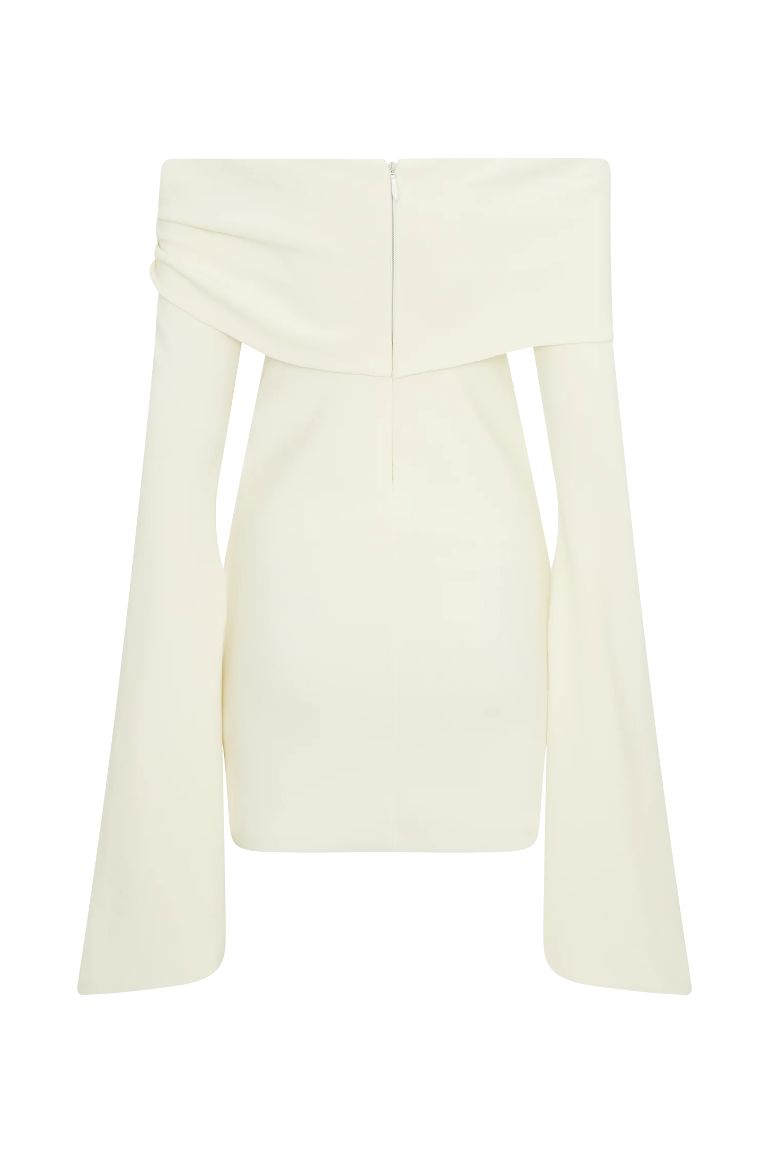 Step into elegance with the DOMINIQUE Off Shoulder Long Sleeve Mini Dress. This striking design features an off-the-shoulder neckline that highlights your collarbone, while the ruched overlay adds a touch of texture and allure. The long flared sleeves bring a dramatic flair, perfectly balancing the fitted silhouette that hugs your curves. Crafted from a stretch fabrication for comfort and ease of movement, this mini-length dress ensures a flattering fit. Finished with a centre back zip closure for a seamless look, this dress is your go-to for turning heads at any occasion.