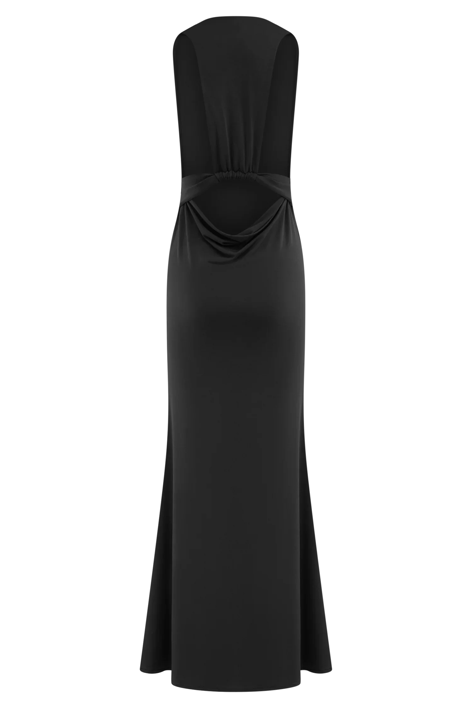 Turn heads in this sculptural silhouette, where fluidity meets form. Designed with a flattering V neckline and sleek front seam, this maxi dress showcases a racer back shape that flows into a softly draped cowl back skirt. The fishtail hem adds graceful movement, while full lining ensures a smooth, flattering finish. Perfect for evenings that call for understated drama and modern elegance.