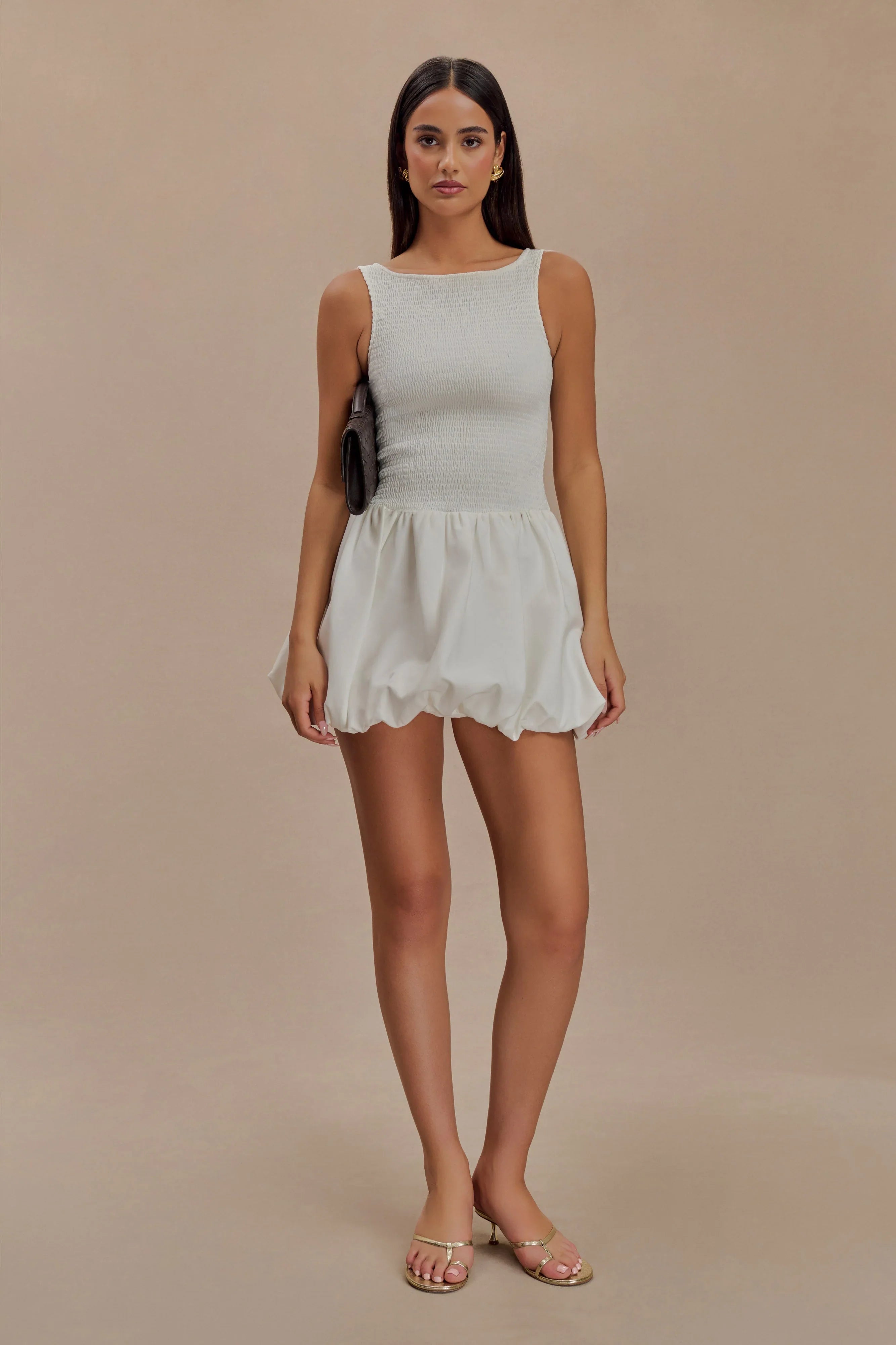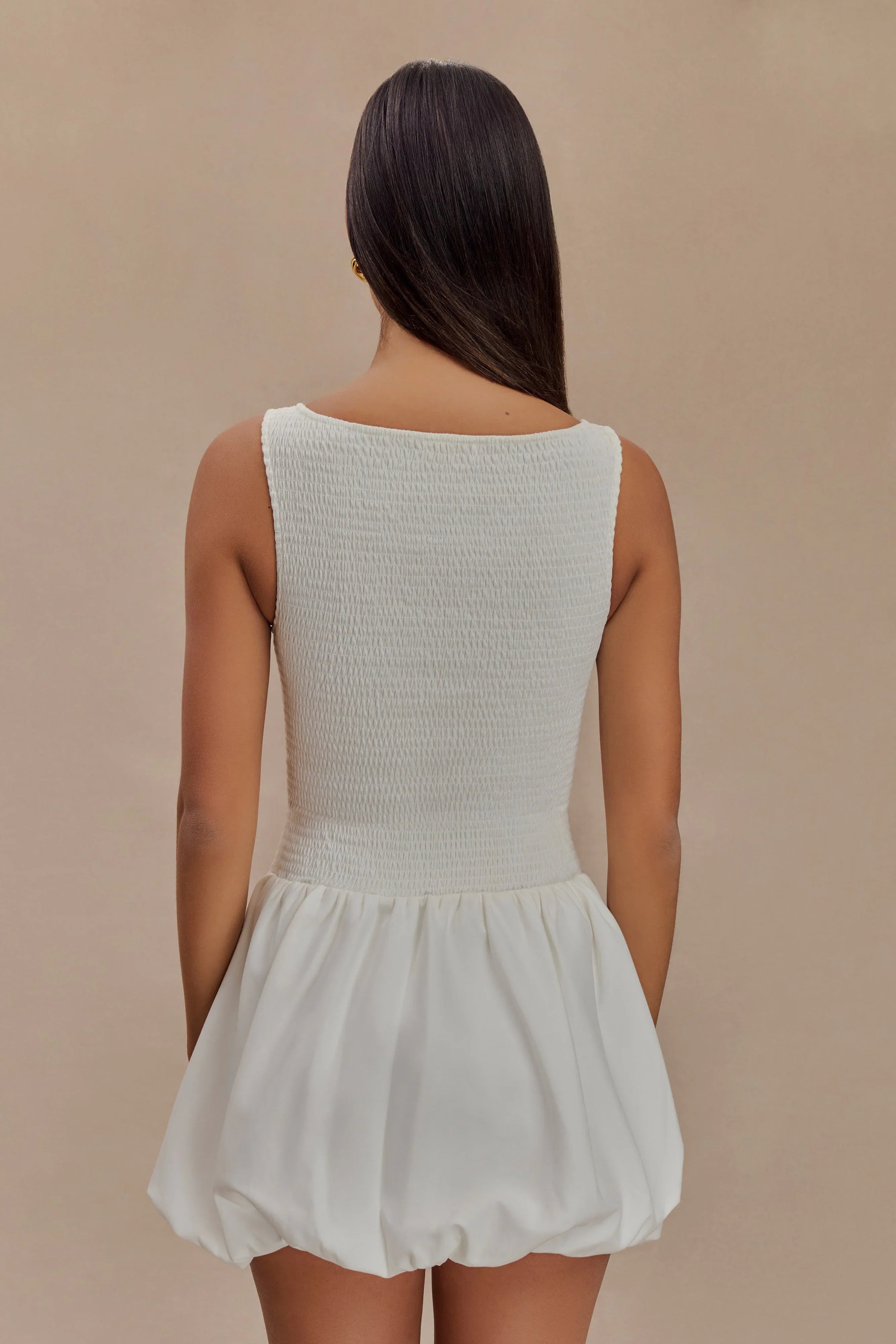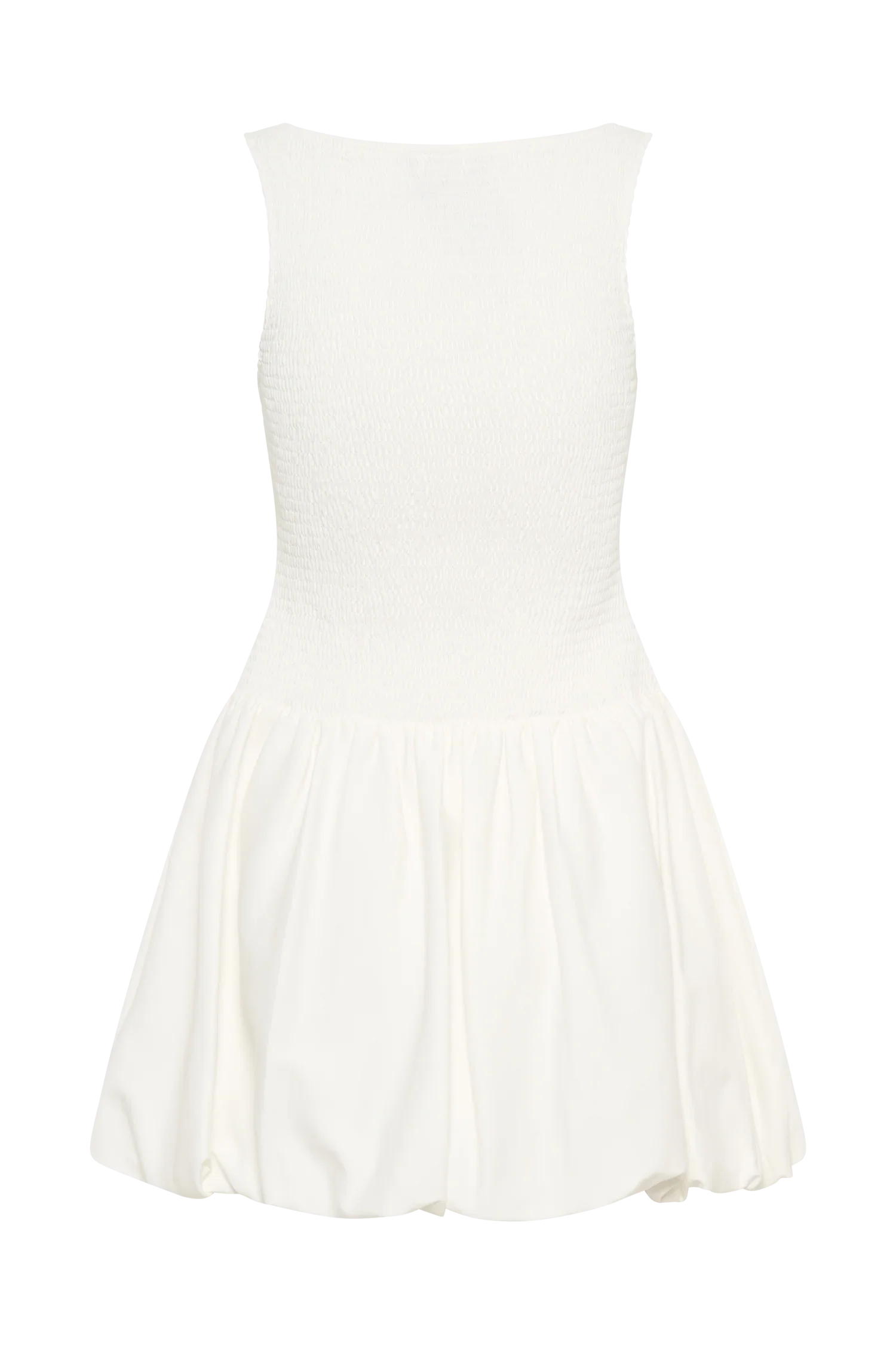 The FELICITY Shirring Bubble Cotton Mini Dress effortlessly blends classic charm with contemporary style. Featuring a boat neckline and sleeveless design, this dress highlights a ruched bodice that accentuates your figure. The bubble skirt shape in the lower part of the dress adds a playful and voluminous touch, while the bound armholes and neckline provide a polished finish. Lined for added comfort, this dress is perfect for making a stylish statement at any event.