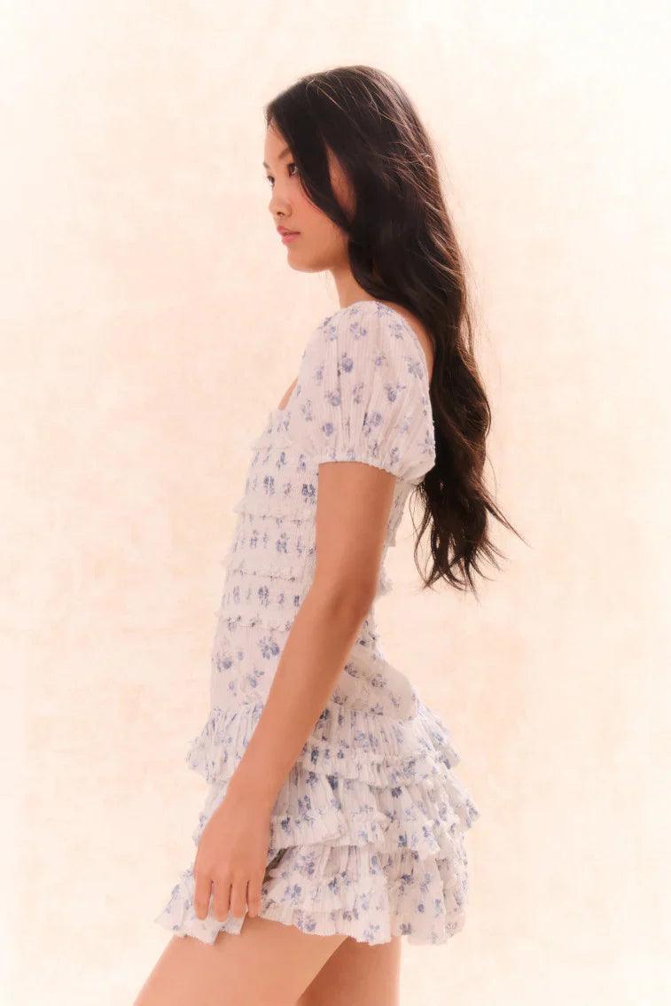Feeling dreamy in the Fellows Dress. This Victorian-inspired mini features a striped cotton dobby fabric with tiny swiss dots interwoven all over for a textural and vintage-inspired feel. Featuring our new heirloom floral print, this pieces begins with short puff sleeves with elastication at the openings for comfort, a square neckline that flows to a smocked bodice with horizontal laces stripped throughout, followed by a fitted waist that releases into a flirty skirt.