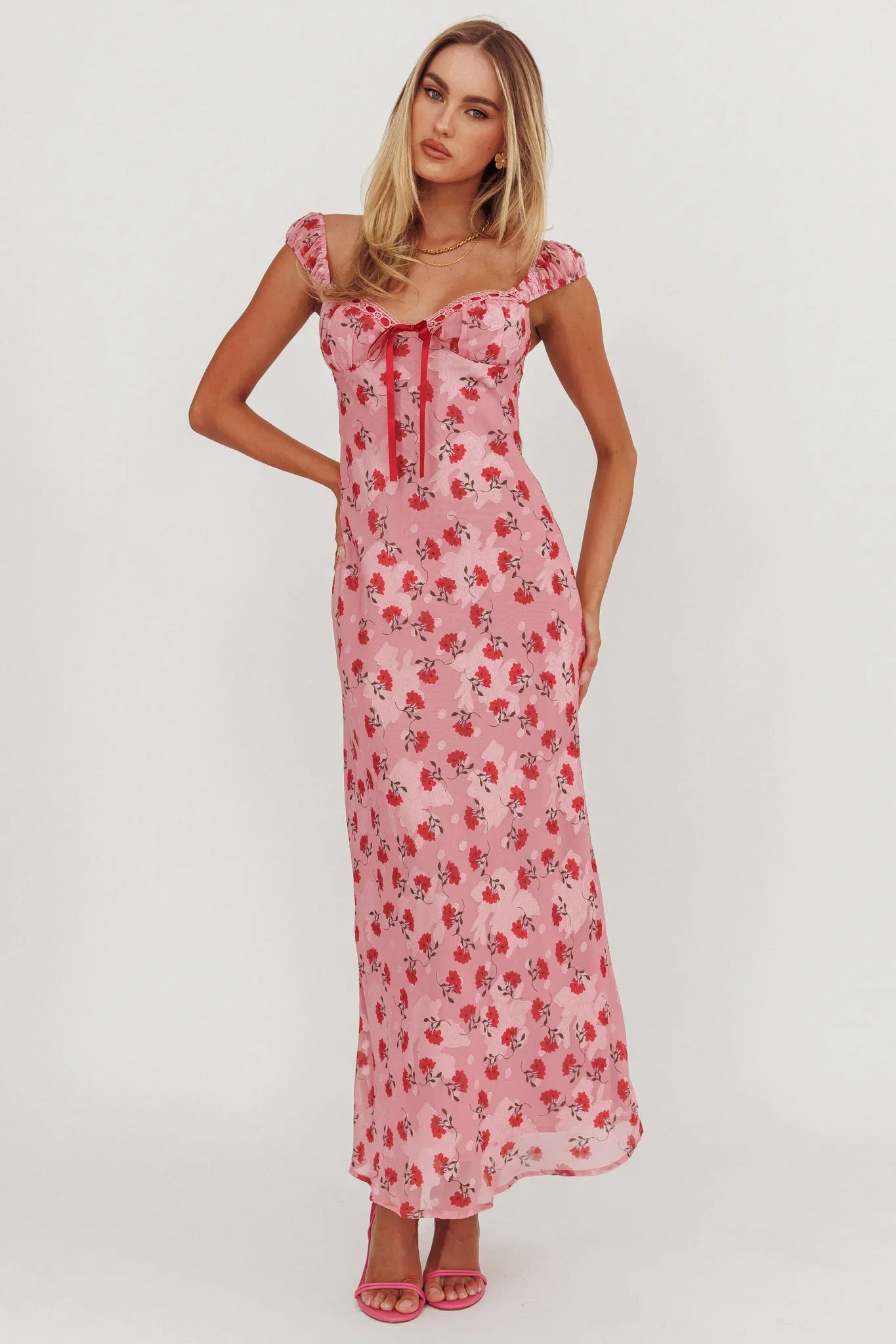 Sweep them off their feet in our gorgeous Femme Belle maxi dress. We are in love with its romantic lace and ribbon trim in the bust and feminine floral print. It's perfect for a date night with your lover teamed with blush heels and a purse for a dreamy look we are loving.