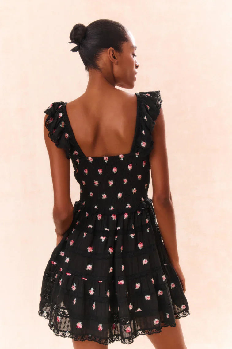 Falling for the Finny Dress. She’s airy, dreamy, and easy to wear. This must-have mini features our soft, cotton striped dobby fabric embroidered with small pink roses. The dress begins with an open v-neck with elasticated flutter sleeves before falling to a smocked waist for comfort and a flattering fit. The bodice and skirt feature a sweet medley of lace and embroidery arrangements throughout. This piece is complete with pockets.