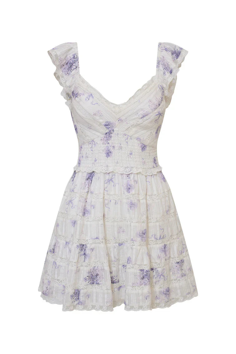 Our beloved Finny Dress arrives for the season as part of our Upcycled Icons Collection, a limited-edition, sustainable capsule featuring our best-selling silhouettes made from remnant LoveShackFancy fabrics. She’s airy, dreamy, and easy to wear. This must-have mini begins with an open v-neck with elasticated flutter sleeves before falling to a smocked waist for a comfortable and a flattering fit. The bodice and skirt feature a sweet medley of lace and embroidery arrangements throughout. This piece is complete with pockets.