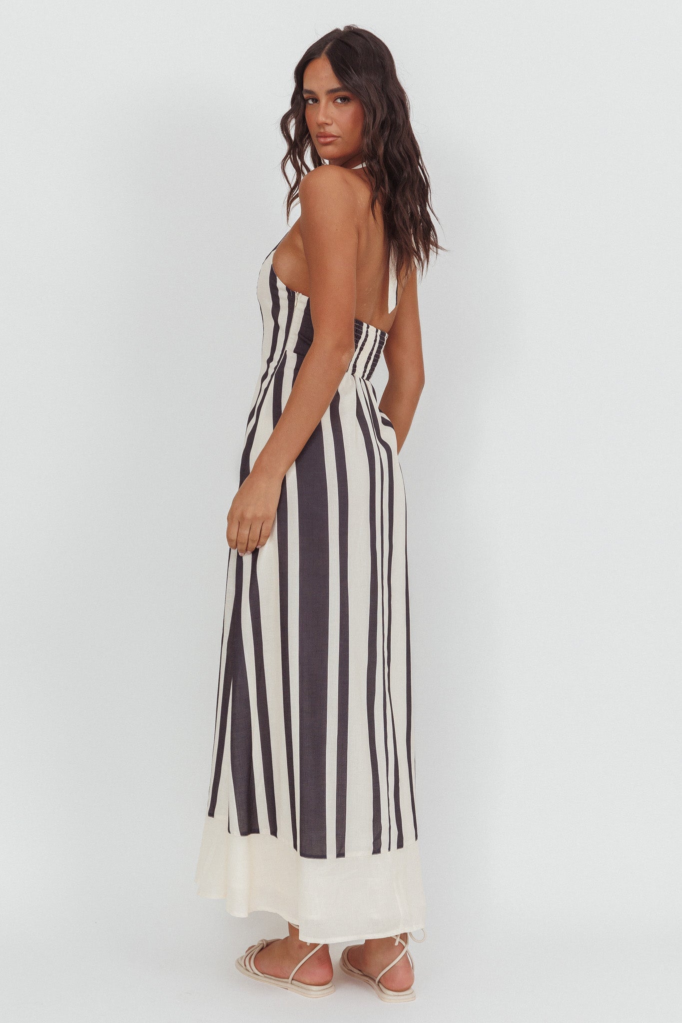 Turn heads in our pretty Florie maxi dress. It features a stripe fabric and halterneck design and is perfect for a brunch date with your besties teamed with sandals and a tote for a super cute look.