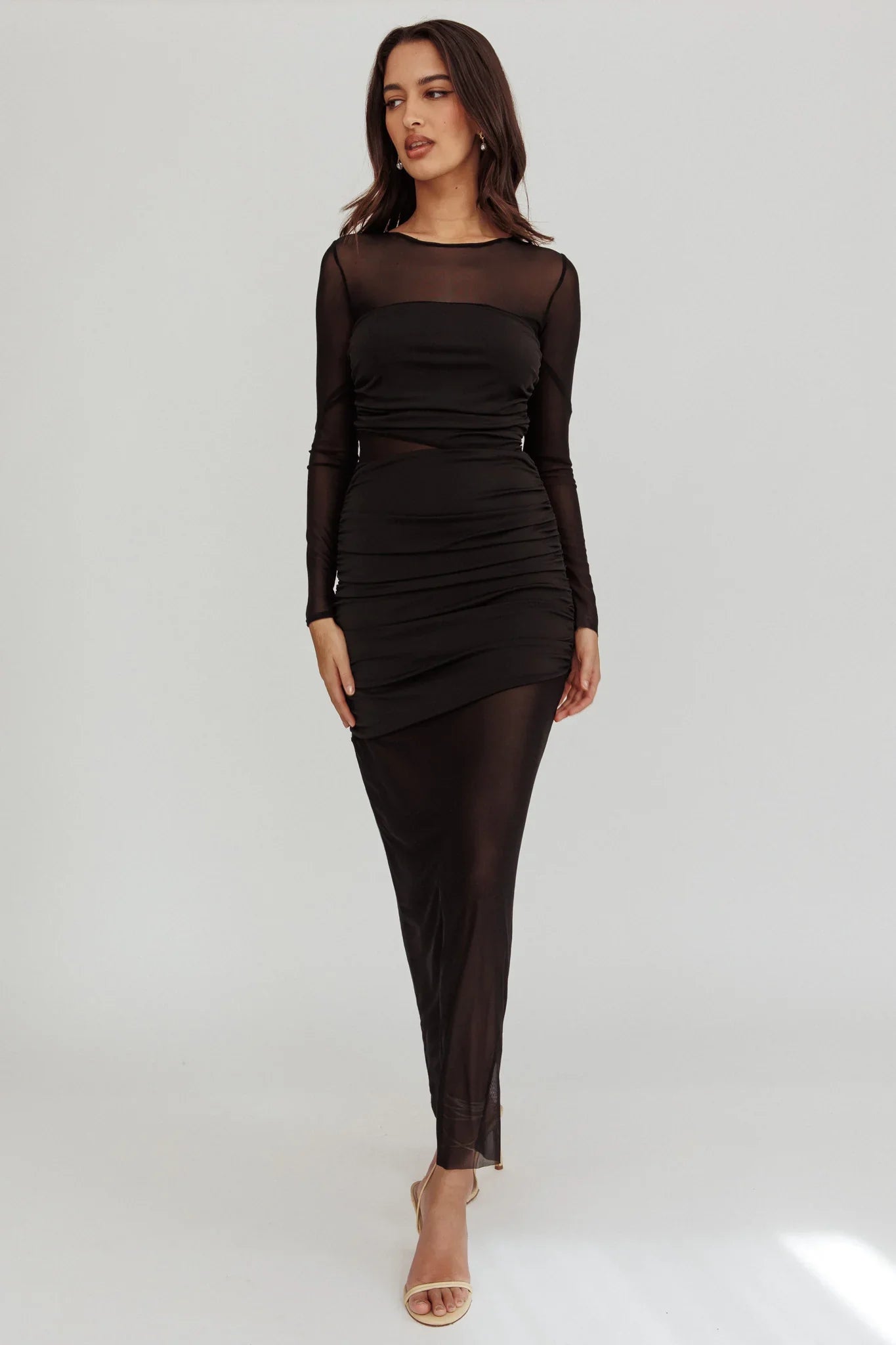 Stand out from the crowd in our Harpa maxi dress! This dress is the epitome of contemporary chic. It features an illusion mesh neckline, a waist cut-out and gathered texture. Take your look to the next level by accessorizing with your favorite jewelry!