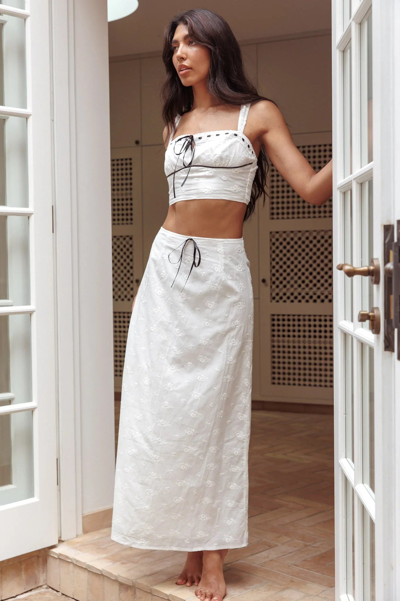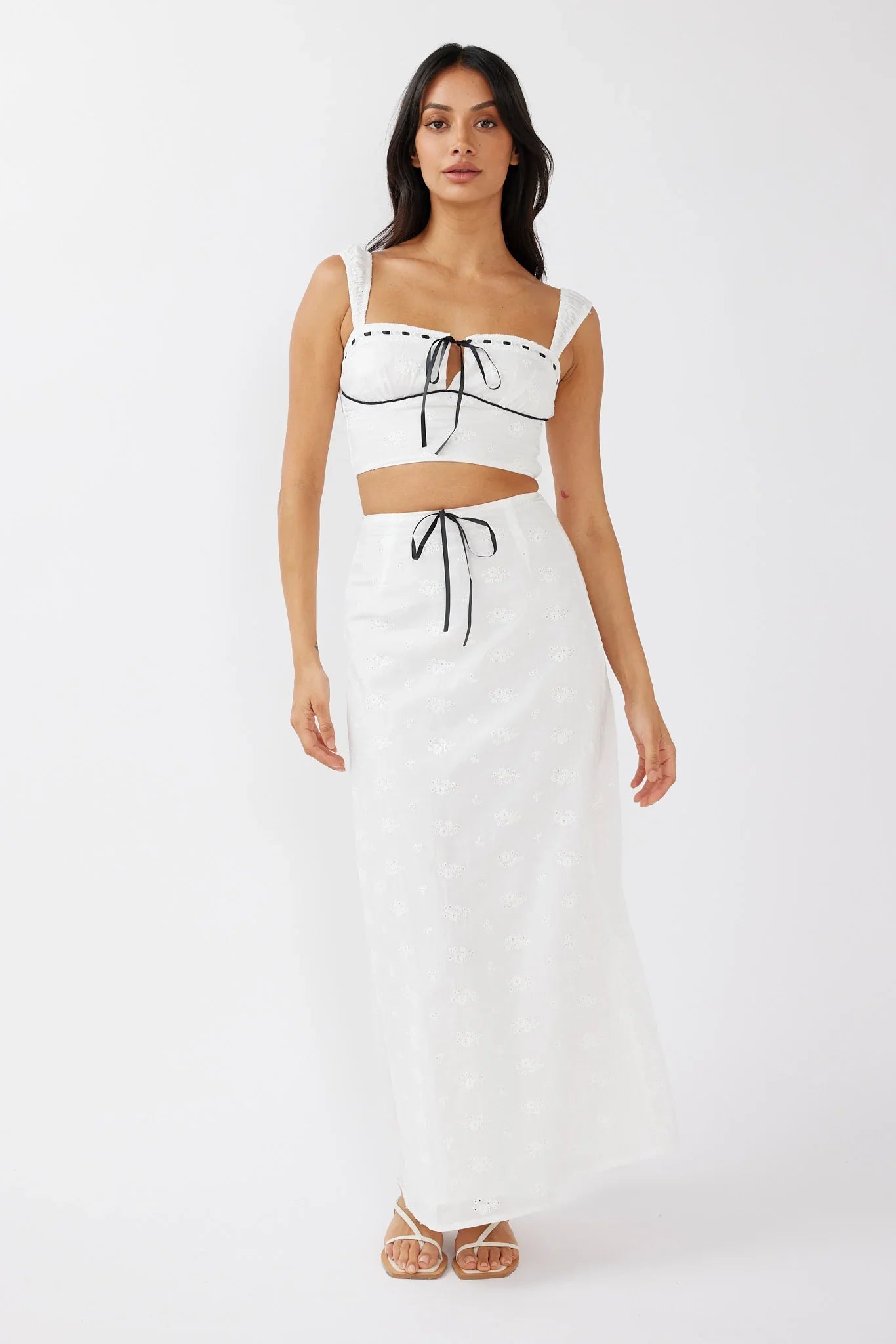 Hey there, cutie! We are in love with our super cute Helga crop top. Featuring a pretty, eyelet embroidery fabric and black ribbon trim. Perfect for Saturdays strolling the farmers markets teamed with its matching skirt. Cute!