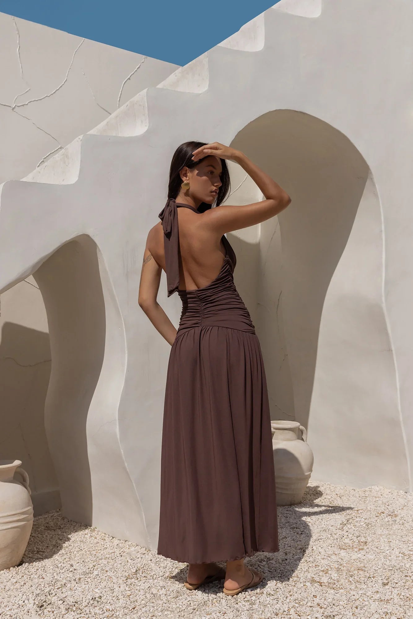 Turn heads in the Horizon Babe Maxi Dress Brown, featuring a halter neckline, a gathered bodice, and a flowy skirt—perfect for sunny days and breezy evenings.