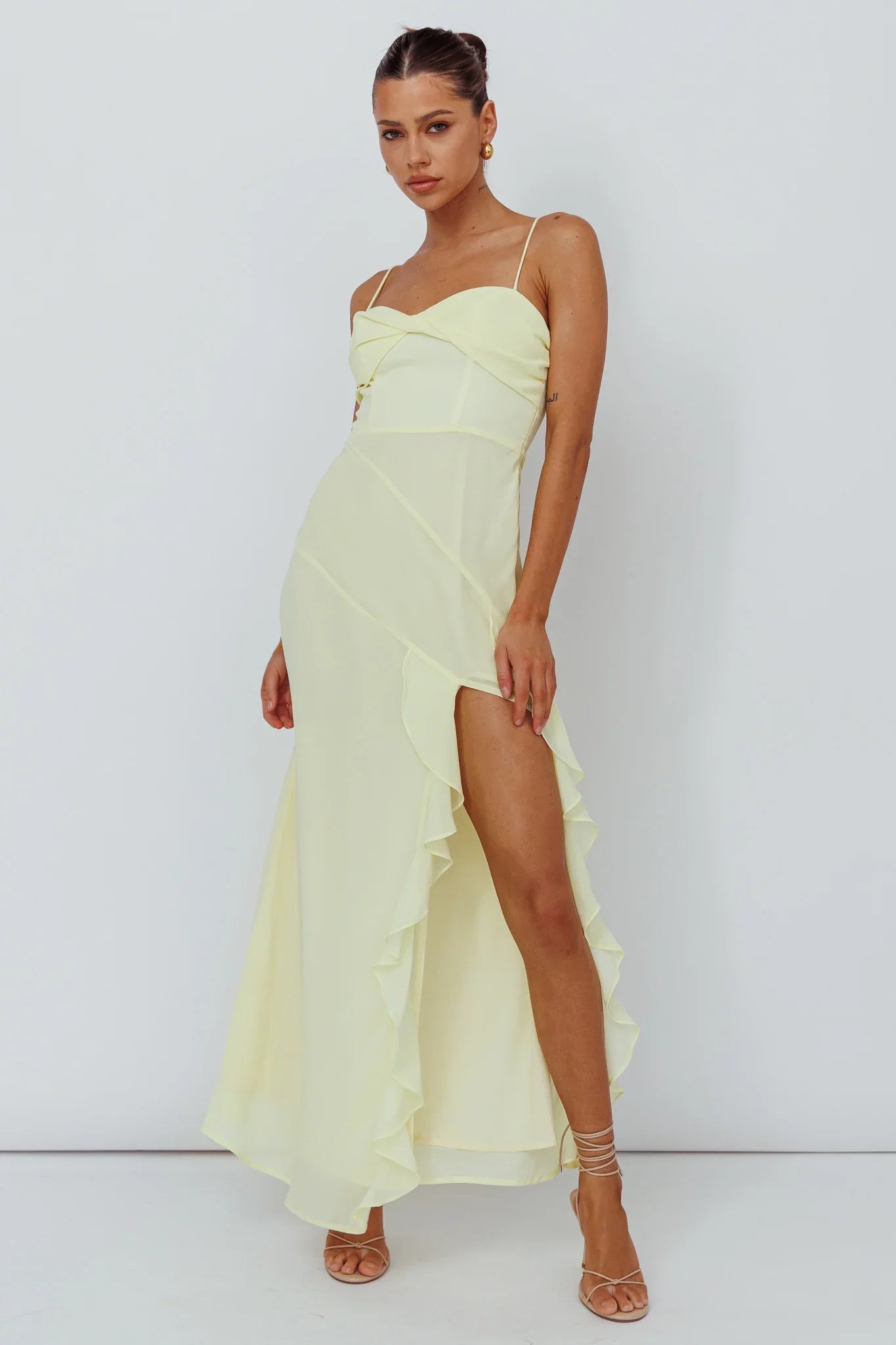 Make an entrance in our gorgeous Jayna dress. Featuring a pretty, ruffle-trimmed split in the front and twist detail in the bust. It would look amazing worn to homecoming or a special occasion! Team it with strappy heels and a clutch for a look that will make jaws drop.