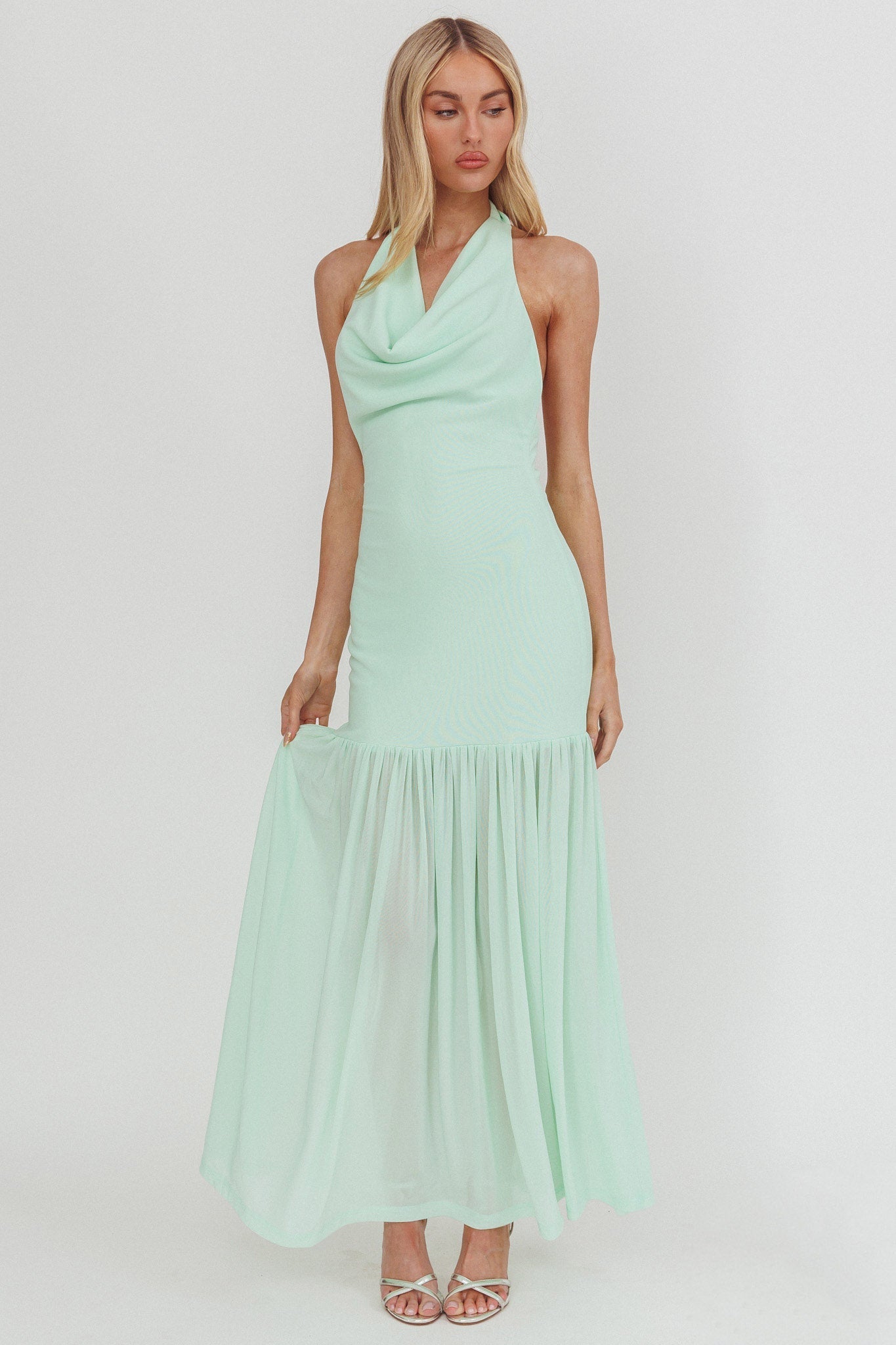 Hello, gorgeous! You will make jaws drop in our stunning Kailyn maxi dress. It features a stunning cowl, halter neckline and sheer hem and is perfect for a wedding or special occasion. Team it with diamante heels and a clutch for an unforgettable look.
