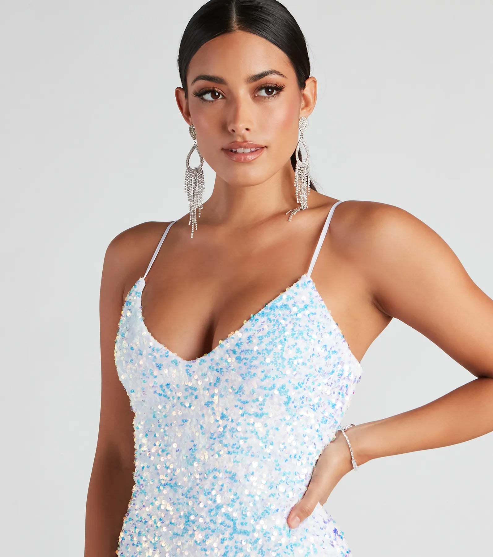 Shine on in a sequin dress that brings the glitz and glam. Kathy features a plunging sleeveless V-neckline, iridescent sequins embroidered throughout, adjustable spaghetti straps for a customized fit, and a mini-length hem with a bodycon silhouette that will hug your curves. The sheer velvet fabric includes a full knit lining and offers a moderate stretch. Complete your A-list-worthy look with clear heels and .