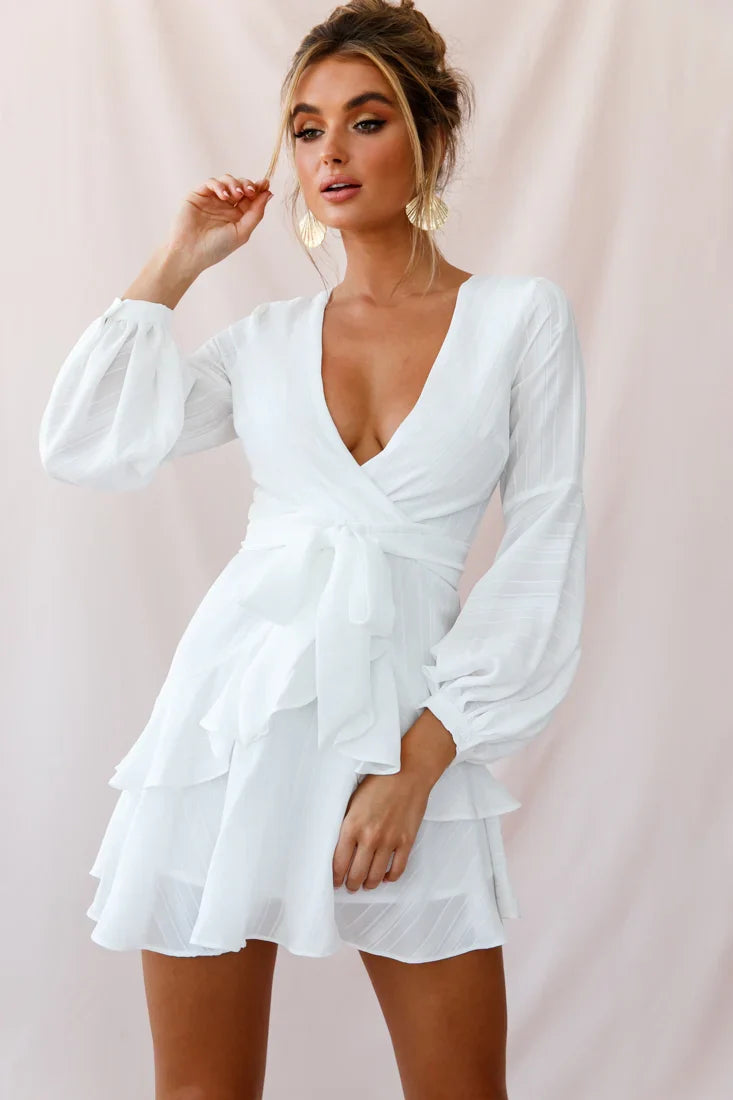 Cocktail party? Meeting the in-laws? This gorgeous dress has you covered. Partially lined, with its on-trend ruffle detail in the skirt, long balloon sleeves and flattering, faux-wrap neckline, you'll be turning heads every where you go. Pair it with single strap nude heels for a look we are loving.