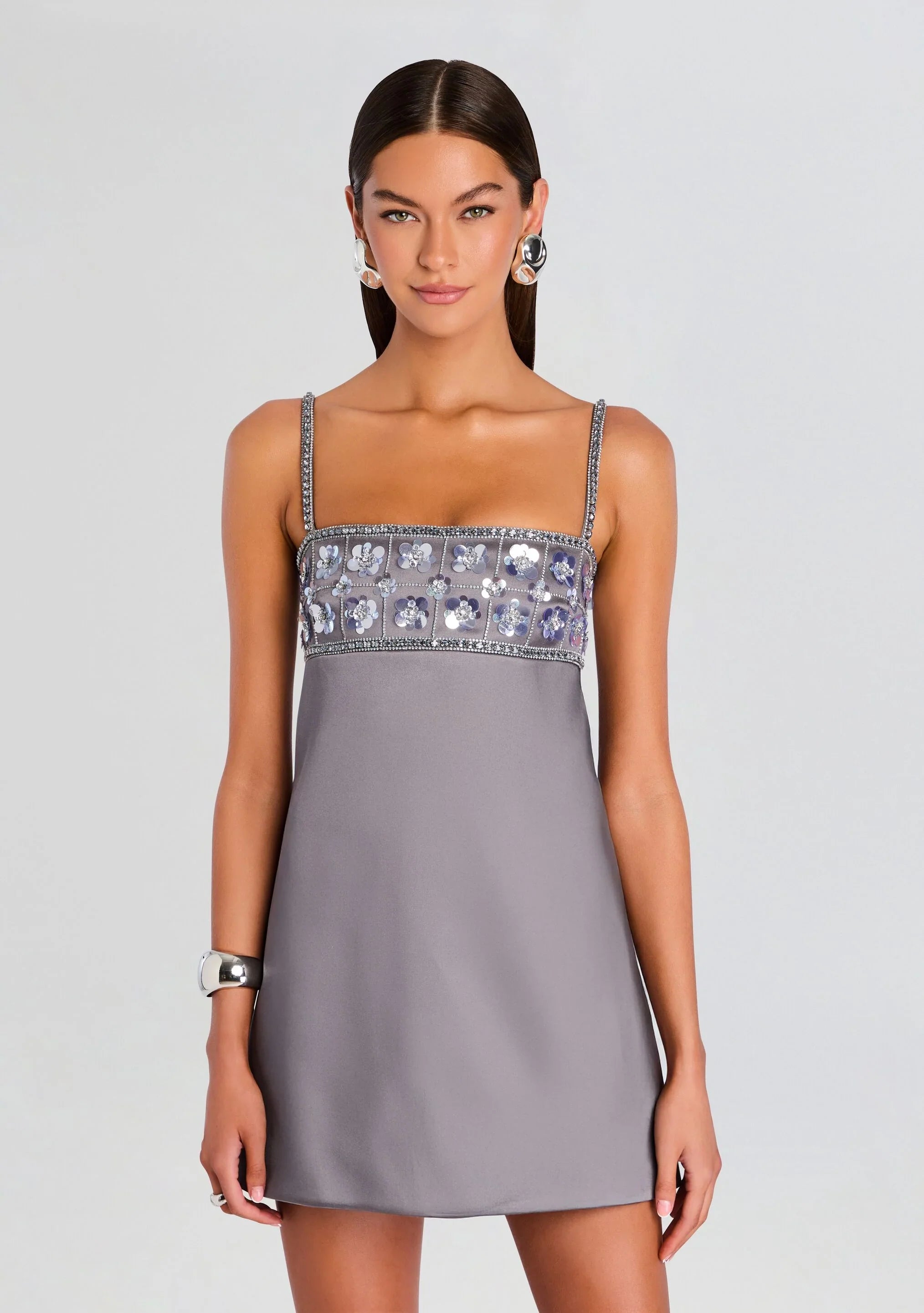 The Lark Embroidered Dress showcases a sleek mini shift silhouette, featuring sequin floral embroidery for a chic, eye-catching look. Perfect for cocktail parties and stylish evenings out, it includes an invisible back zipper for a seamless fit. Shown here in Dusk/Silver.