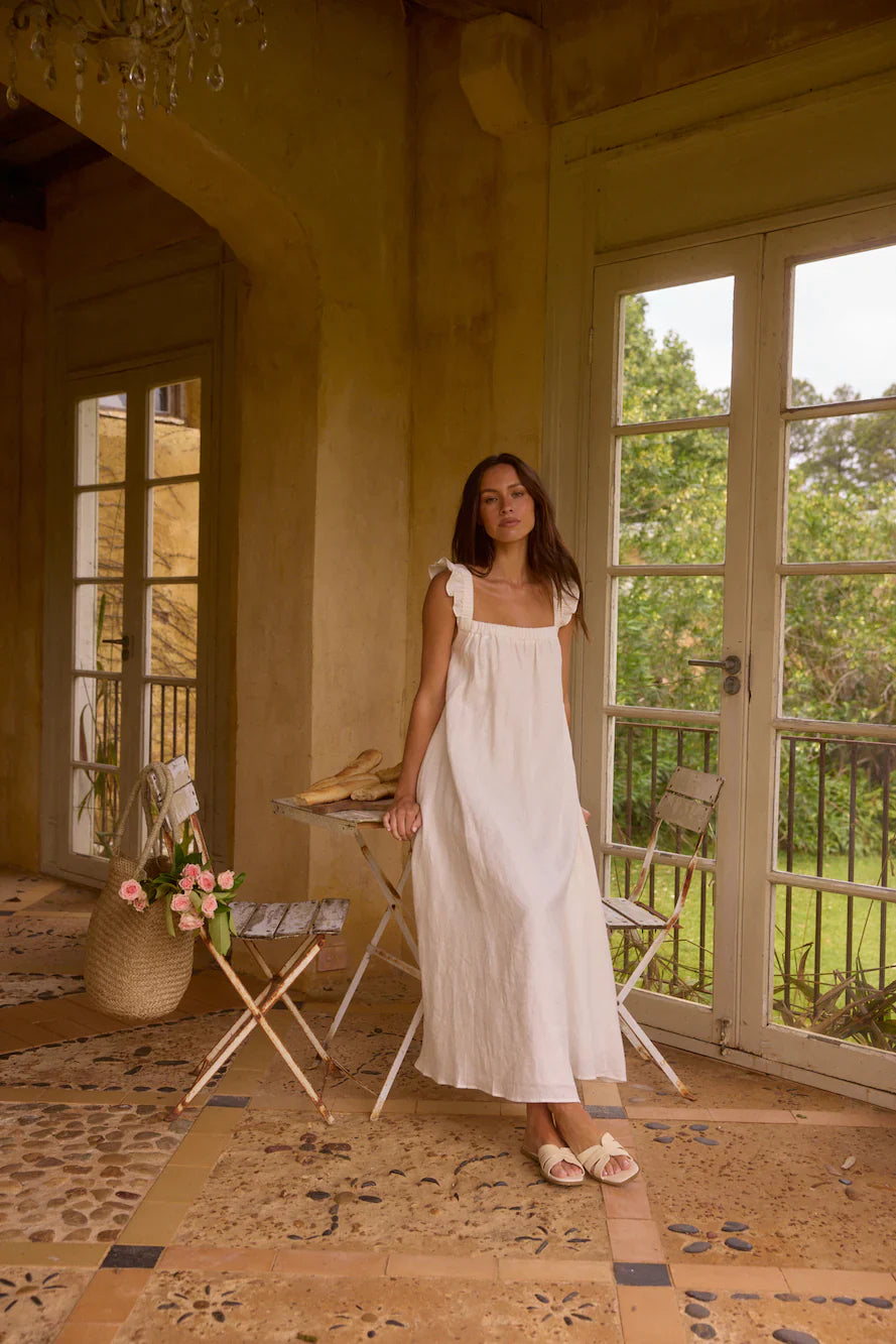 Crafted from 100% premium linen, this dress exudes a classic, feminine charm with a touch of rustic elegance. Its square neckline and gathered bodice create a structured yet soft silhouette, while the wide, ruffled straps add a romantic, cottage-inspired touch. The flowy, A-line skirt and premium linen fabric give it an effortless, breathable feel, perfect for warm-weather occasions or laid-back, yet sophisticated, styling.