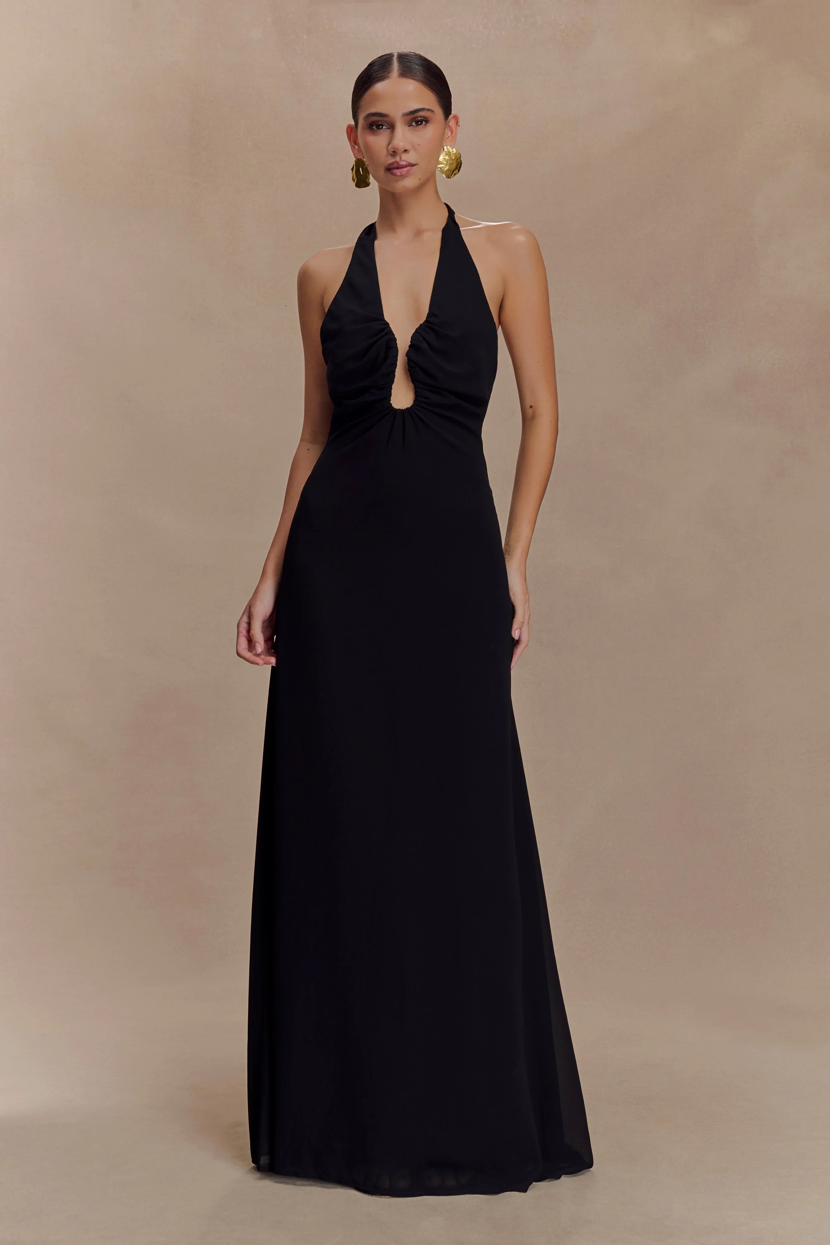 The MALAKHAI Chiffon Halter Maxi Dress is your go-to for effortless glamour, from sunlit lunches to evening soirees. Featuring a deep V halter neckline with subtle front gathering and a structured wire insert to hold its shape, this silhouette flatters with a bodycon fit through the bodice and a soft A-line flare at the hips. A side seam invisible zipper keeps the finish clean, while the sleek hardware neck closure adds a refined edge. Fully lined and designed without padding for a natural, easy fit, this dress is made to move with you from day to night.