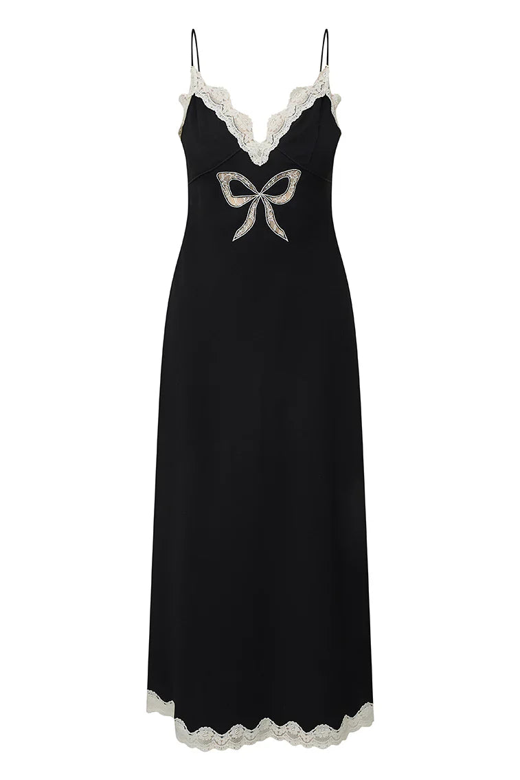 The Manuela Dress returns with a luxurious, lightweight crepe fabric giving the piece a drapey, chic effect. The piece features a charming bow motif applique at center front designed from vintage-inspired lace. This slinky maxi features scallop lace at the neckline and the sweep for a dreamy finish.