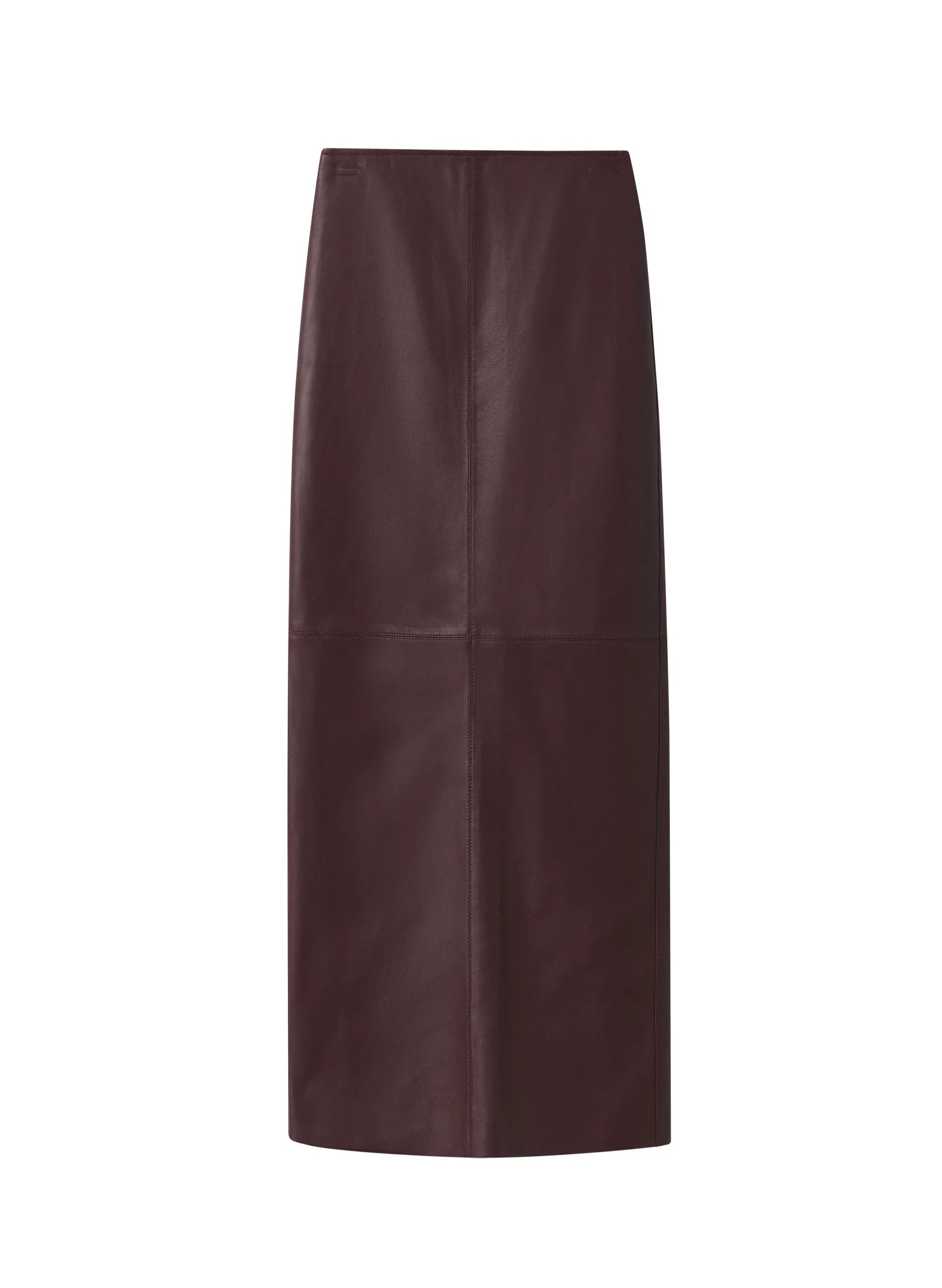 The Marta Skirt is crafted from 100% soft lamb leather in an umber hue. This long midi silhouette falls straight from hip to hem and features both a slit and zip closure in the back. Shop Bottoms.