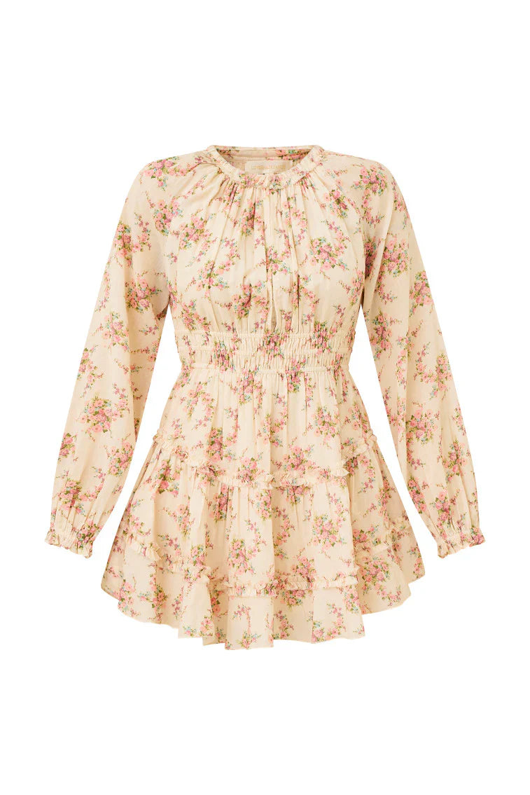 Add a touch of charm to your wardrobe with the Victorian-inspired Mellini Dress. This easy, cotton frock features an heirloom floral print all over. The piece begins with long sleeves elasticated at the cuff, a keyhole detail at the high neck that moves to elasticated tunnels at the waist for a comfortable and flattering silhouette that descends to an airy, pleated skirt.