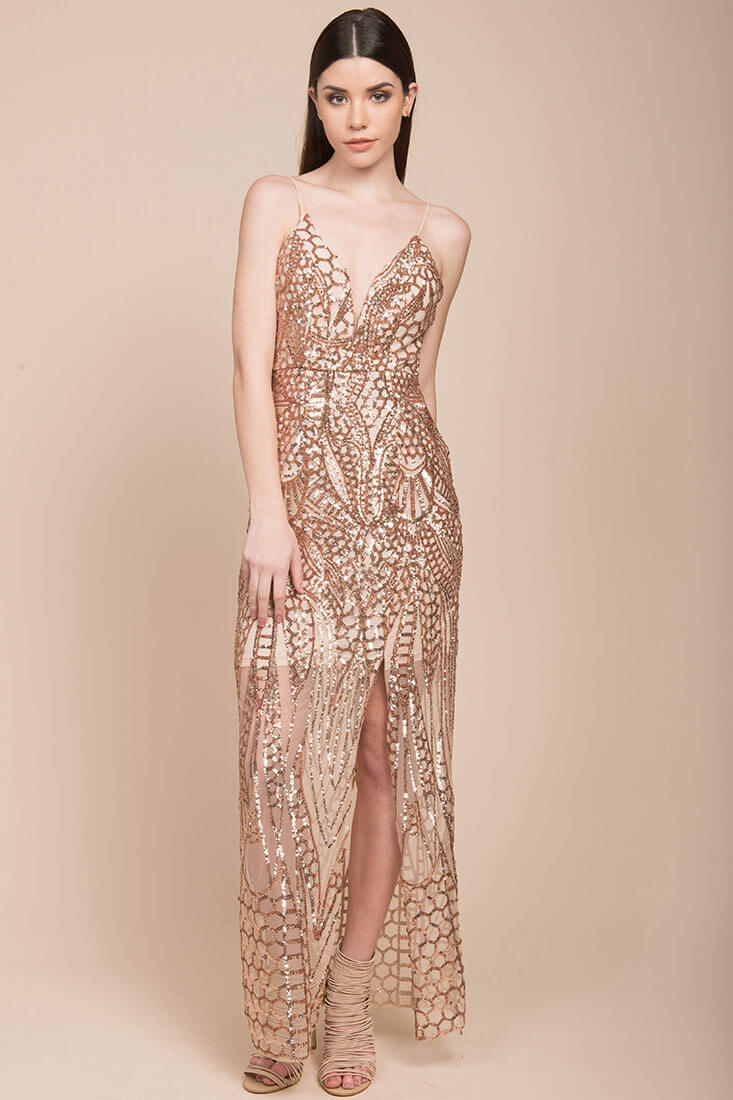 Glowing gold and a stardust soul, this golden sequined dress with elegant deep V neckline is an absolute fave for formals. Wear with golden stilettos and unleash that inner diva.
