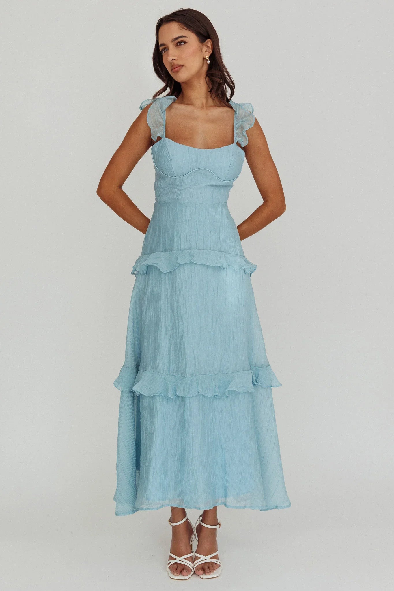 Jaws will drop as you walk by in our gorgeous Moonlit Moment dress. We are loving the ruffle trim detail and pretty lace-up back! Perfect for a special occasion party or date night. Team it with strappy, nude heels and a mini purse for an unforgettable look.