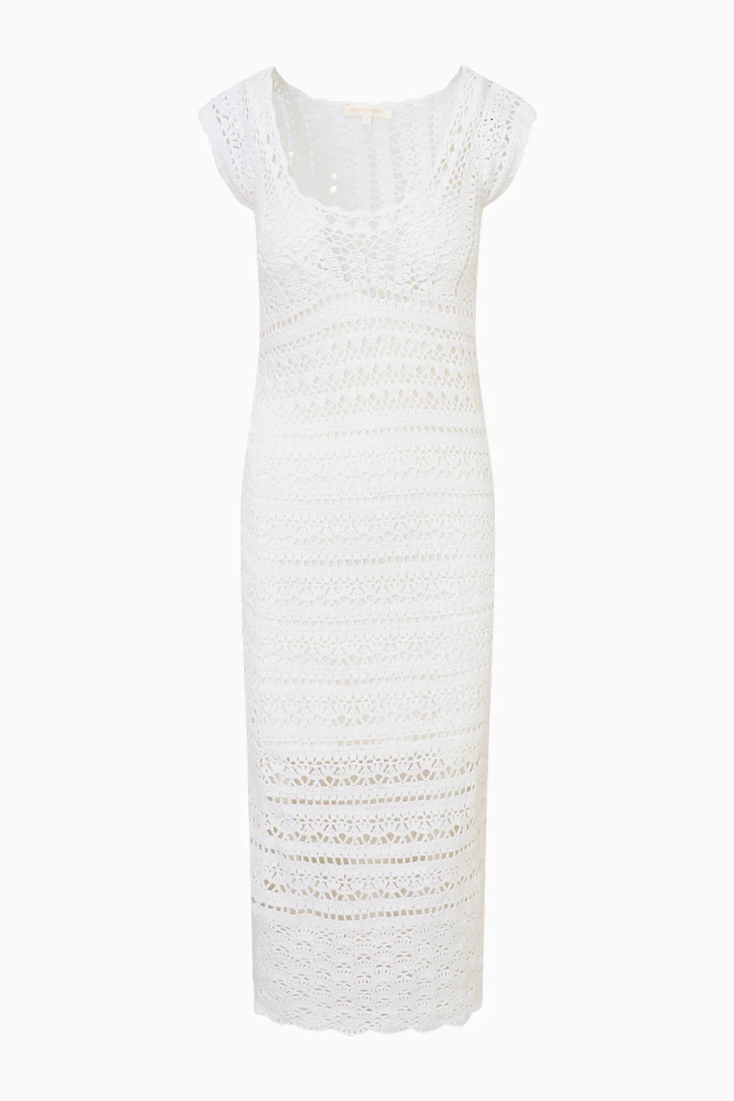 The Mora Dress debuts with a sheer, open hand-crochet fabric all over. This maxi dress has a slim, flattering fit, a wide scooped neckline, extended shoulders with cap sleeves, and placed crochet patterns striped throughout. This piece comes with a separate jersey lining slip to wear if you’d like it less sheer. This piece can be worn as a chic cover up or on its own as a dress.