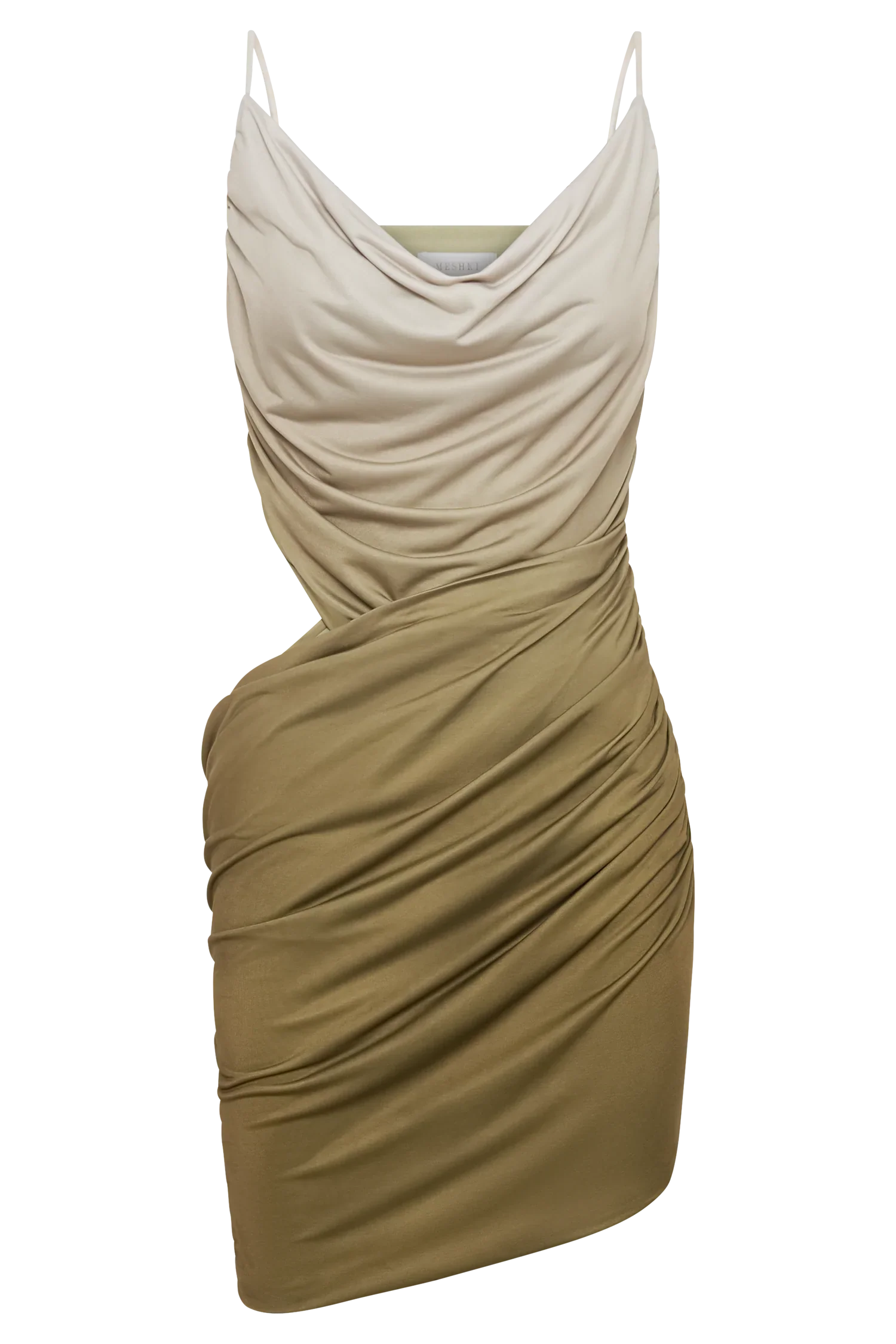 The NELLIE Cowl Draped Slinky Mini Dress is a striking piece that exudes elegance and allure. Featuring a graceful cowl neckline and adjustable straps for a perfect fit, this mini dress is designed to flatter. The asymmetrical draped waistline and hip cutout add a modern, edgy twist, while the asymmetrical hem enhances its unique silhouette. The ombre print and lined design ensure both style and comfort, making this mini dress a standout choice for any special occasion or night out.