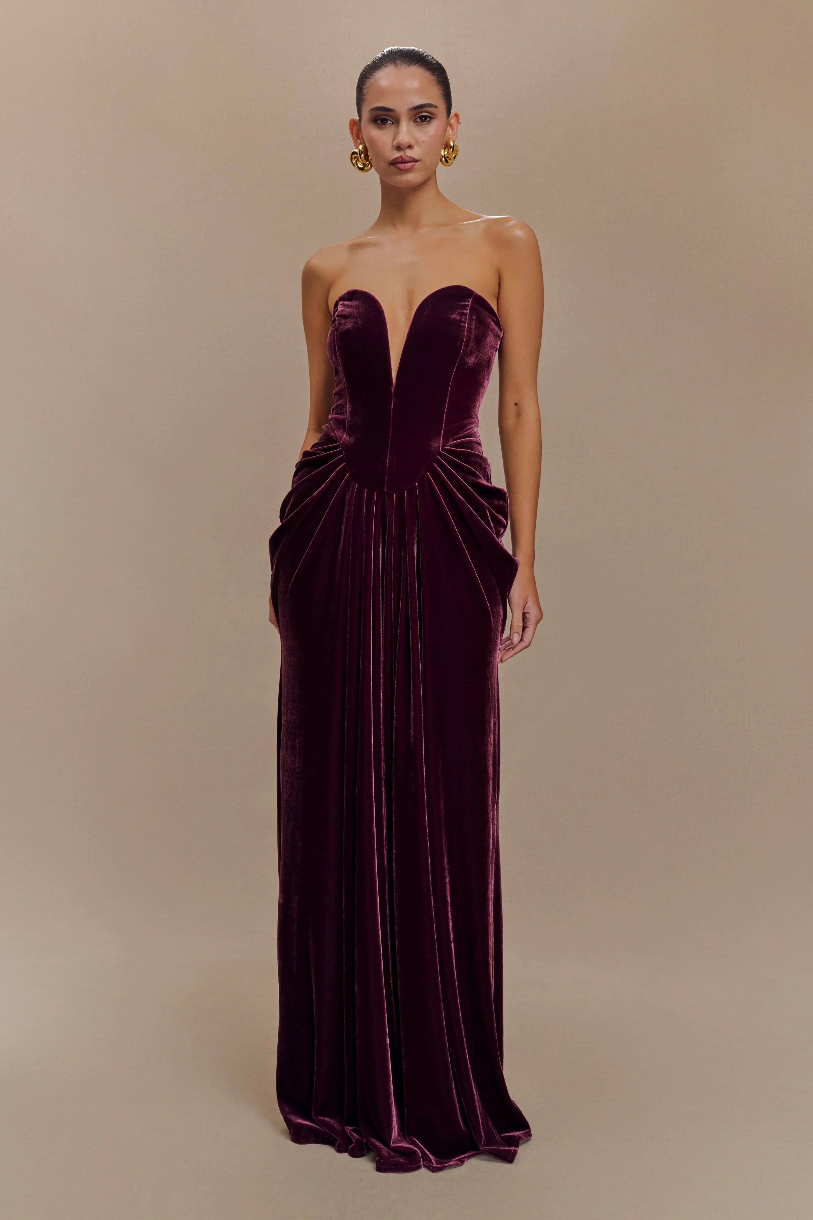 The PAIGE Strapless Velvet Maxi Dress combines elegance with sultry sophistication. Featuring a strapless design and a deep plunge neckline, it beautifully accentuates the décolletage. The corset waist shapes and defines your figure, while gathering at the hips adds movement and volume, creating a flattering silhouette. Crafted from rich velvet, the dress has a luxurious finish that catches the light with every step. With a centre-back zip for a secure fit, the maxi length offers a dramatic and graceful finish.
