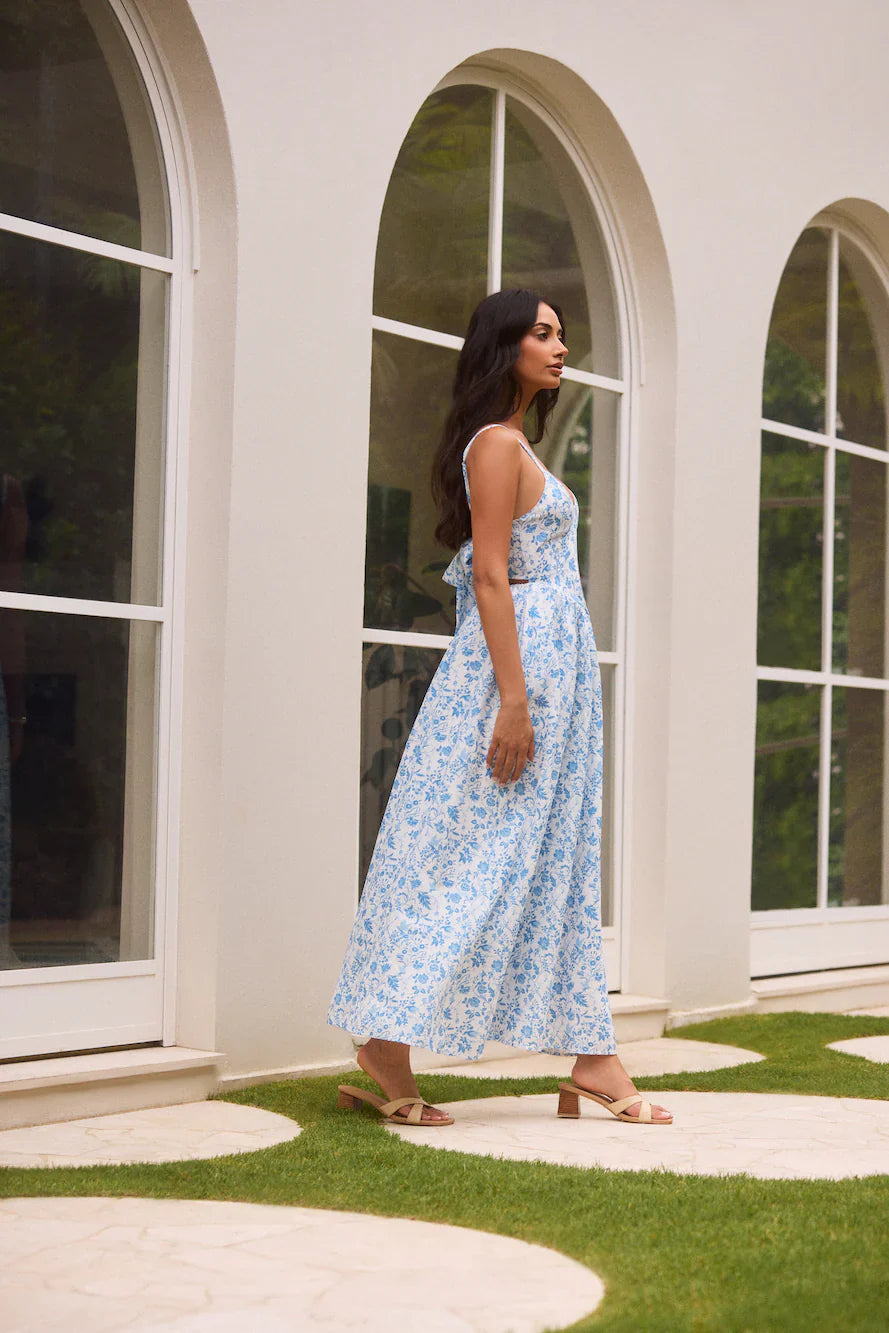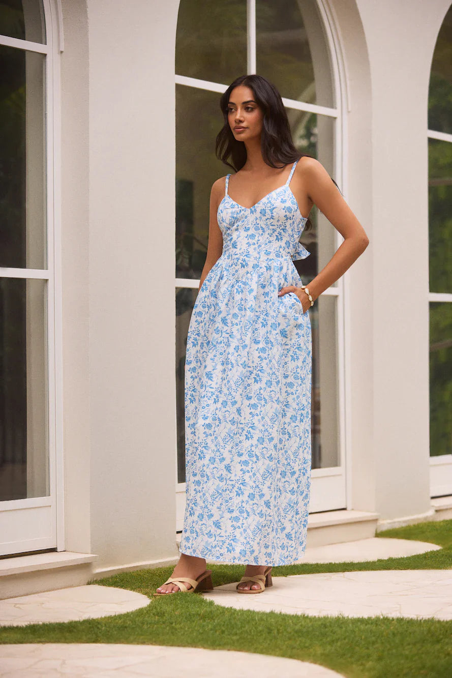 The Painted Skies Maxi Dress in Blue is a vision of elegance and charm, featuring a crisp white base adorned with delicate blue floral patterns. This flowing maxi dress has a flattering V-neckline and a playful back bow detail, adding a touch of romance to its timeless design. Perfect for any occasion, this dress can be styled up with heels and bold jewelry for a sophisticated look or dressed down with sandals and a sunhat for an effortless, breezy vibe. Whether at a garden party or a casual brunch, this dress is sure to make a graceful statement.