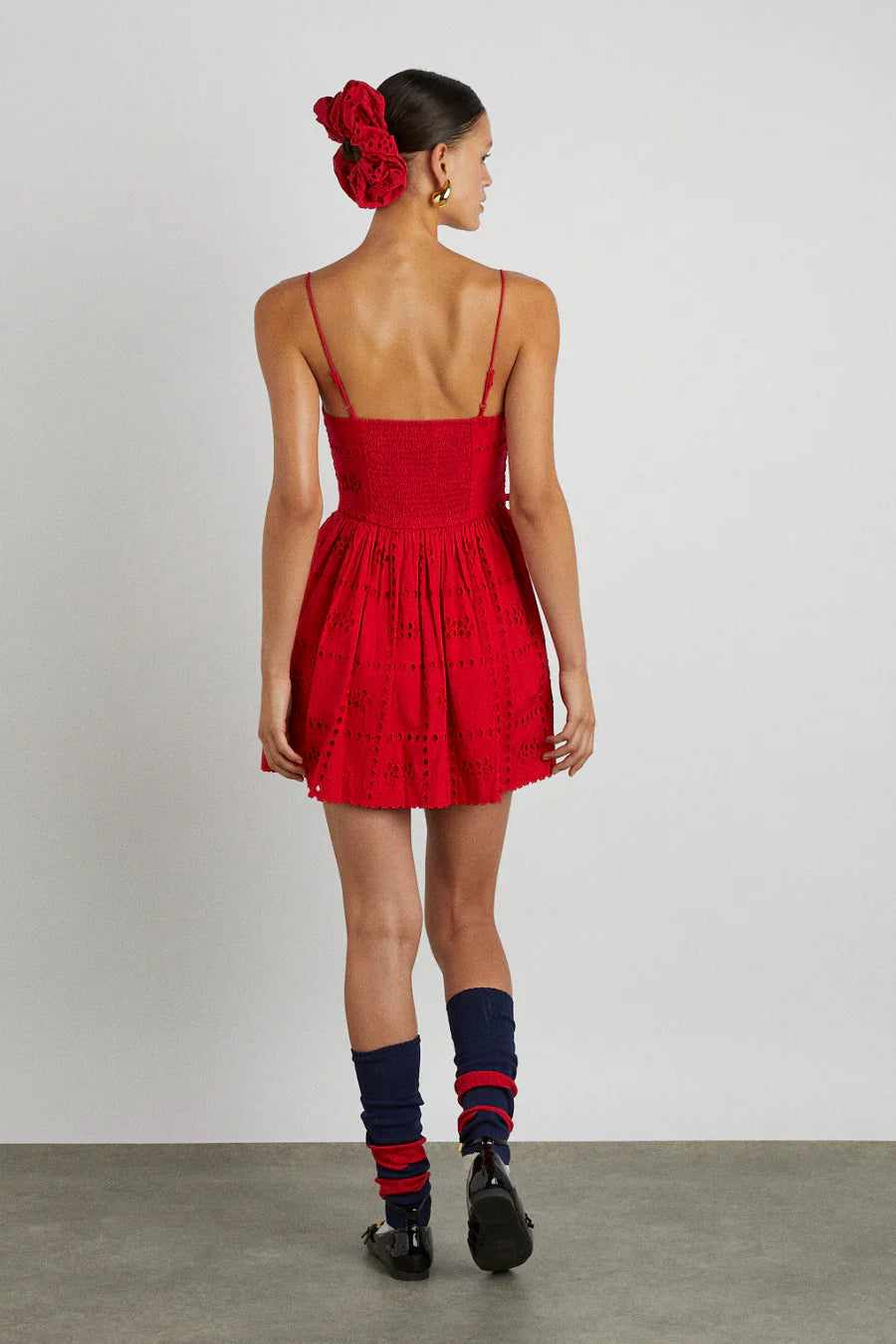 The Penelope apron dress is our red broderie mini dress featuring a corset style bodice with waist seam details and bows that gather into a fuller skirt.