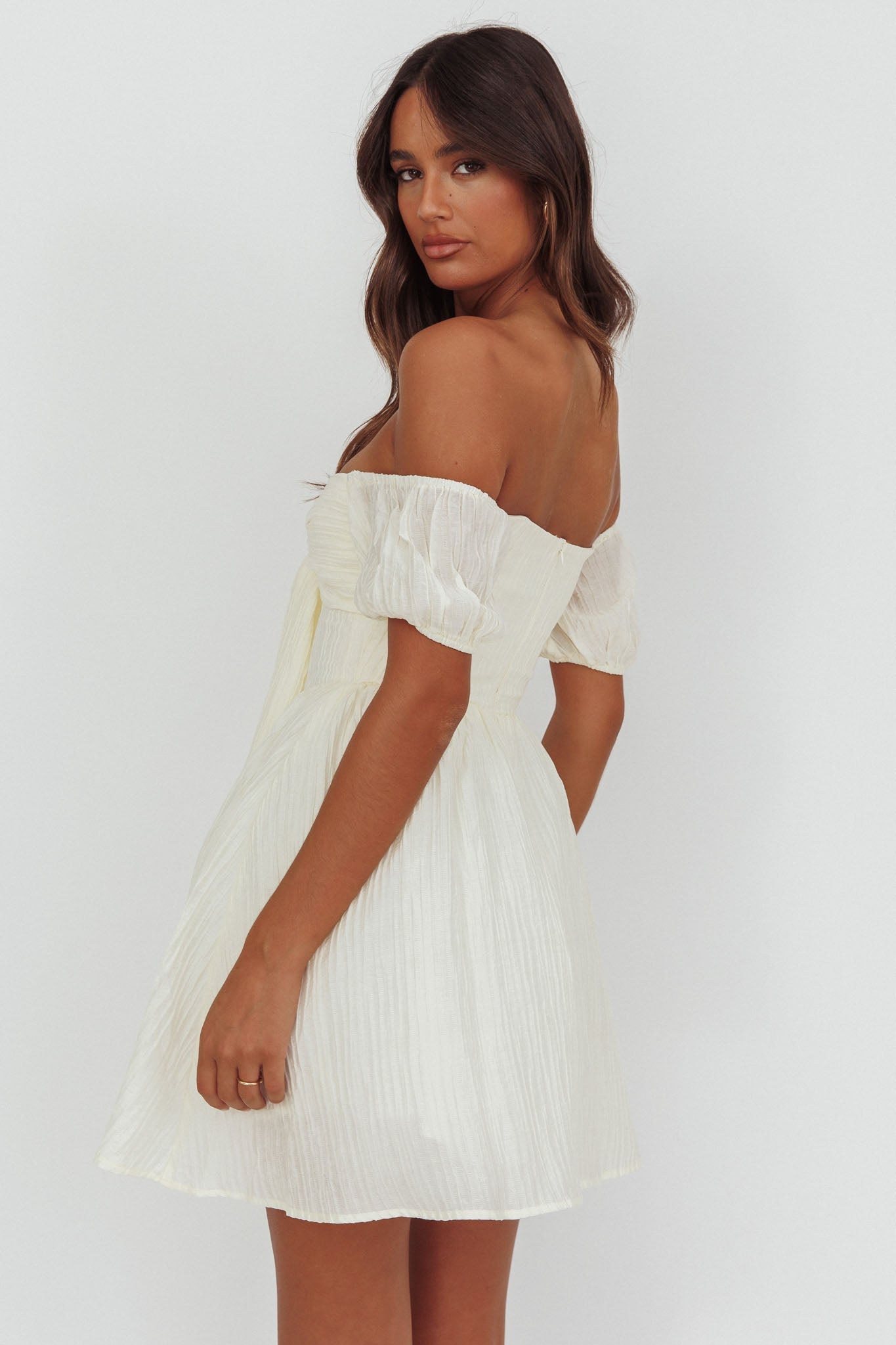 Make them stop and stare when you walk by in our adorable Perfect Worlds mini dress. It features a tie in the bust and off-shoulder sleeves. Perfect for a flirty date night with your love. Team it with kitten heels and a saddle bag for an It Girl look.