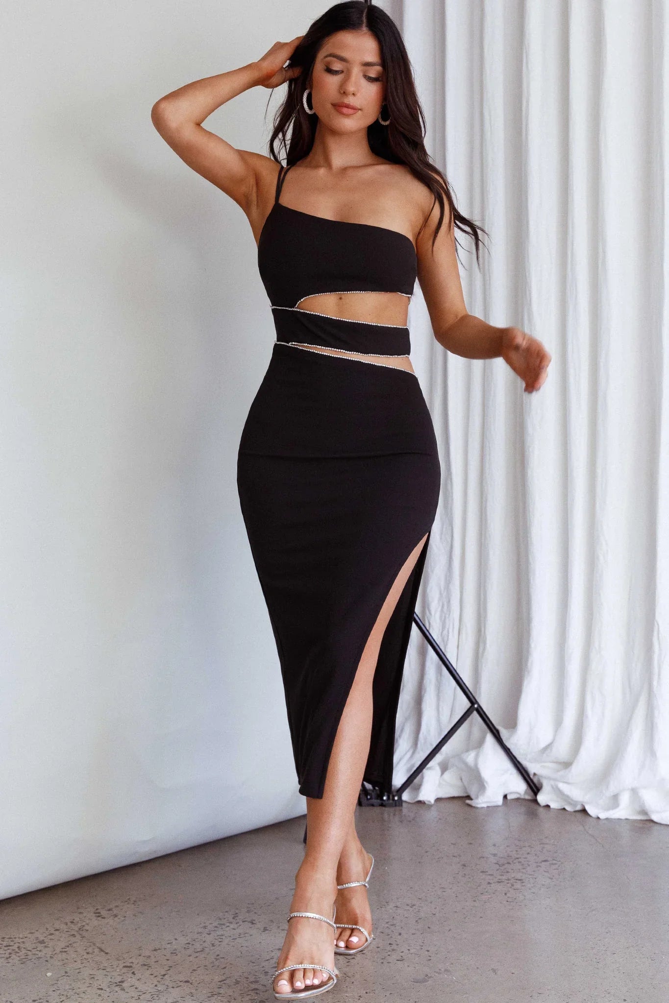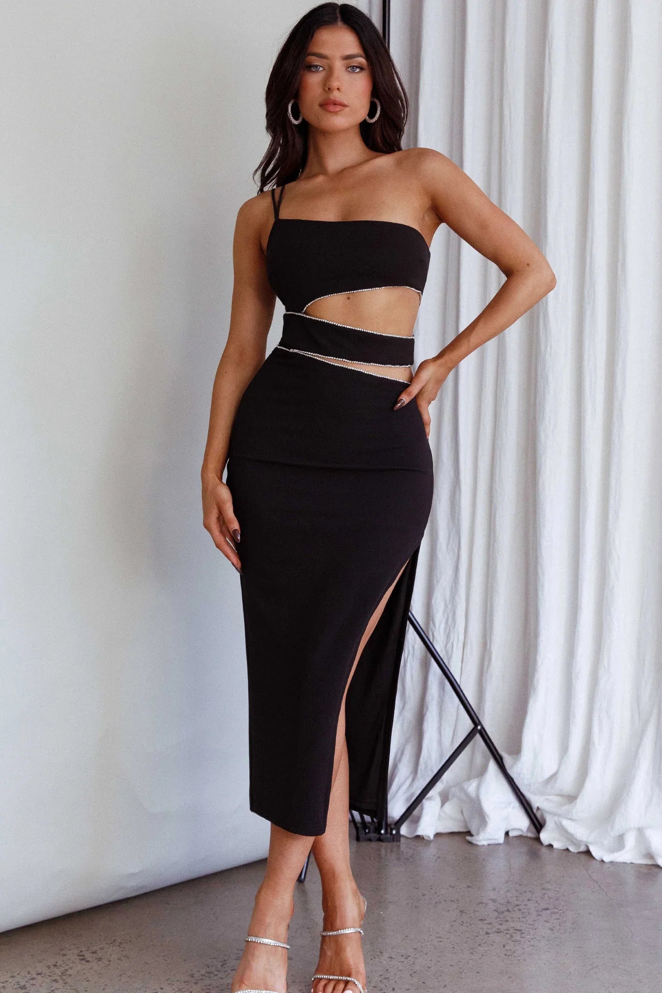Make an entrance in our stunning Raye midi dress. Featuring cut-out details and a rhinestone trim, we've fallen in love! Perfect for a birthday party or special occasion teamed with diamante heels and a chic clutch.