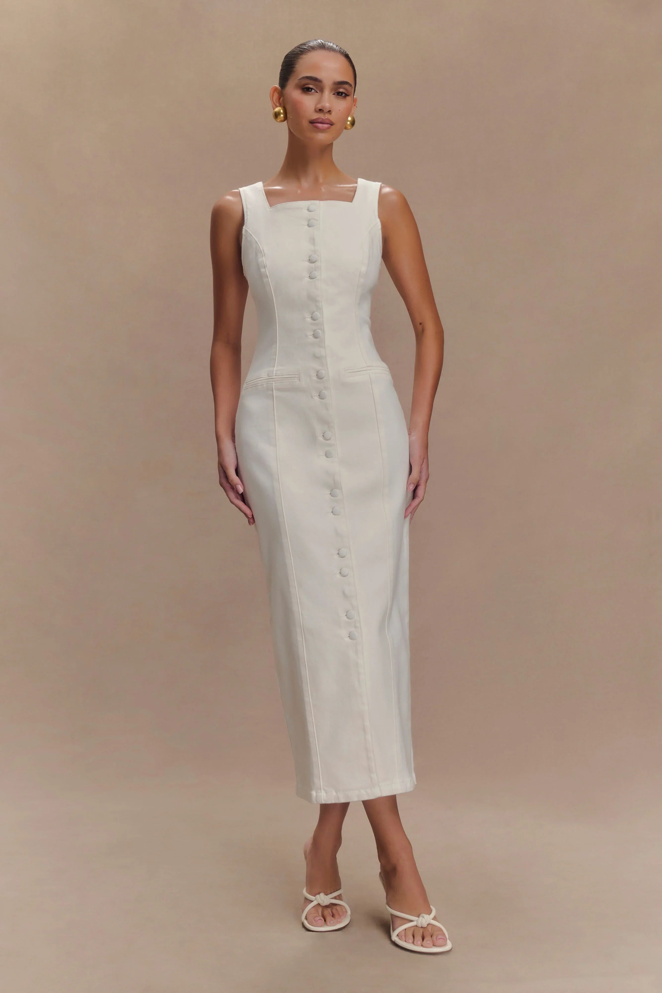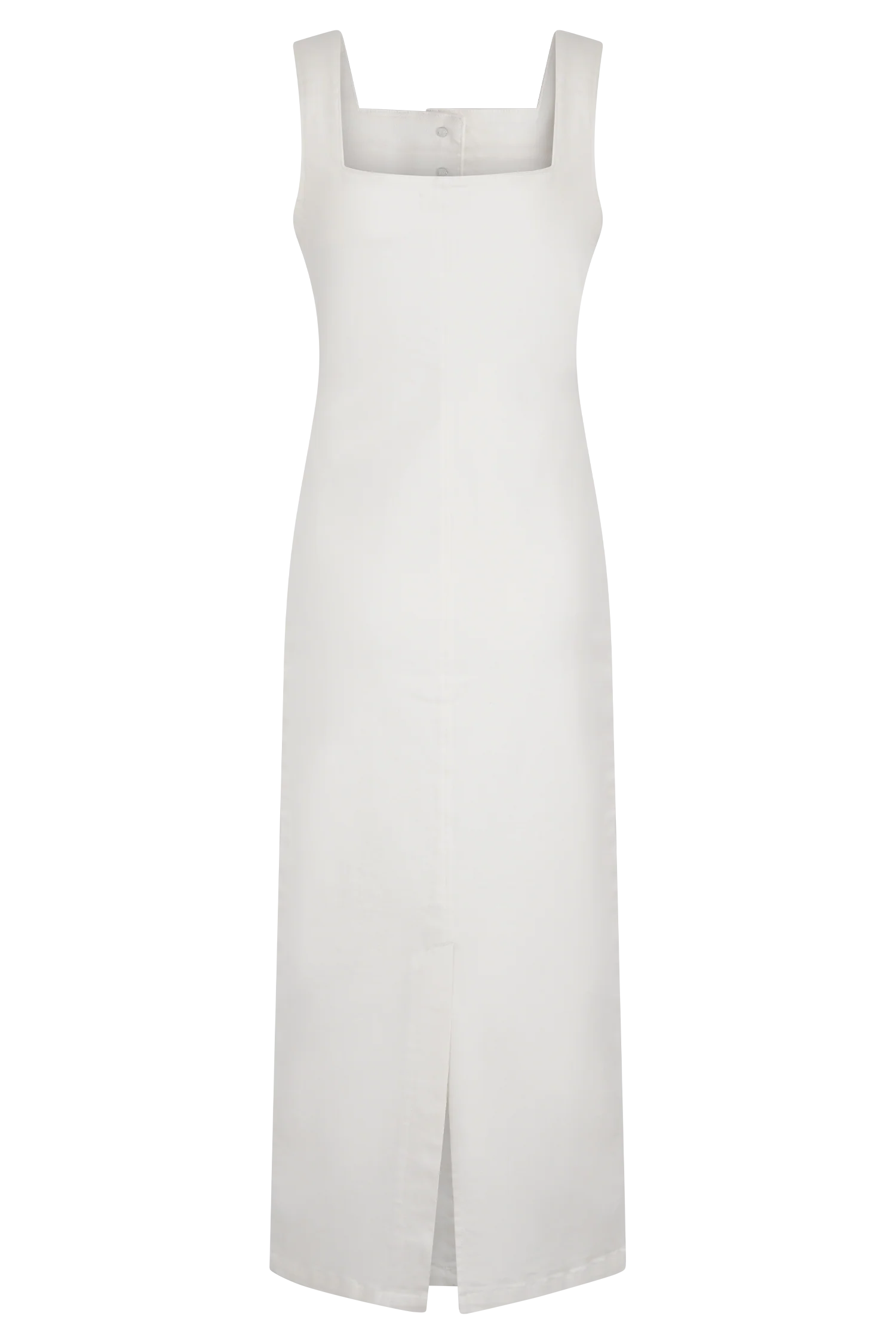 The REYNA Denim Midi Dress blends classic charm with a modern silhouette. Featuring a square front and back neckline, this dress is designed with a functional button front for versatile styling. Non-functional front pockets add a touch of detail while shaping panelling enhances the fitted, figure-flattering design. With its midi length, this dress is perfect for both casual days and elevated outings, offering effortless style in every step.