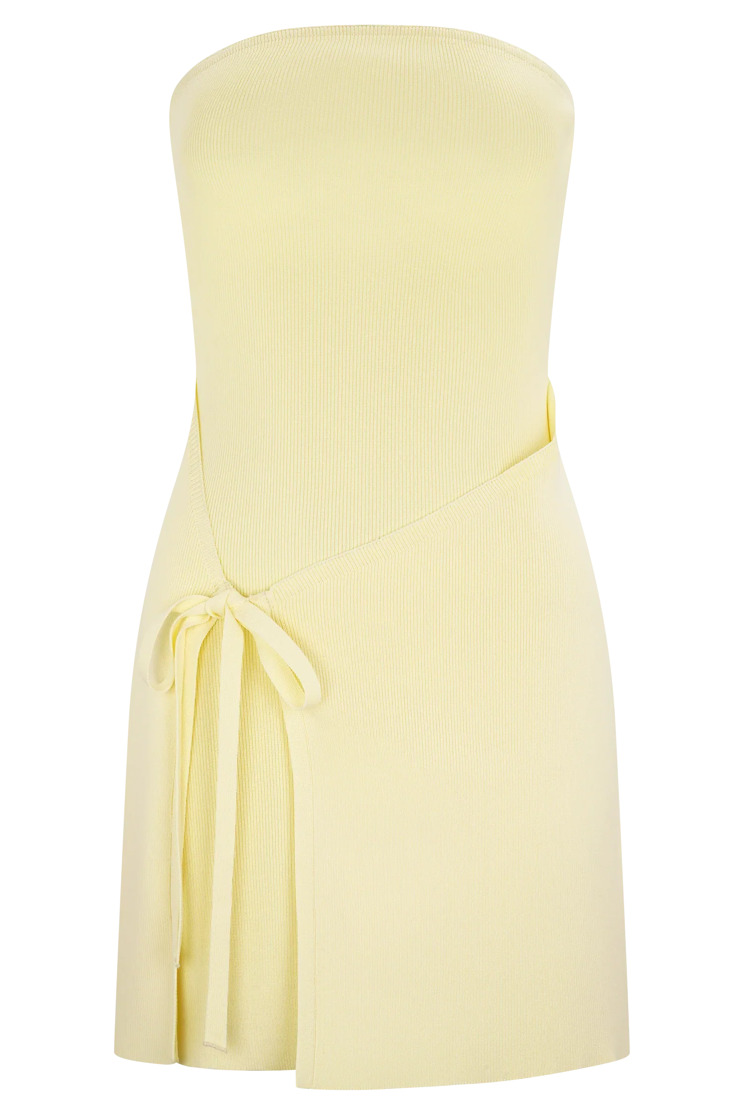 The RIAN Strapless Knit Mini Dress is a bold and stylish choice that captures a youthful and energetic vibe, perfect for evenings out or casual summer days. This strapless design showcases a clean and simple neckline that emphasises the shoulders and collarbone, making it a flirty and fashionable statement piece. An asymmetrical overlay provides a unique textural element and visual interest, while the functional hip tie allows for a customisable fit, adding both style and practicality. Crafted in a mini length, this unlined dress is ideal for those who love to showcase their legs and enjoy the freedom of a lightweight, breezy garment.