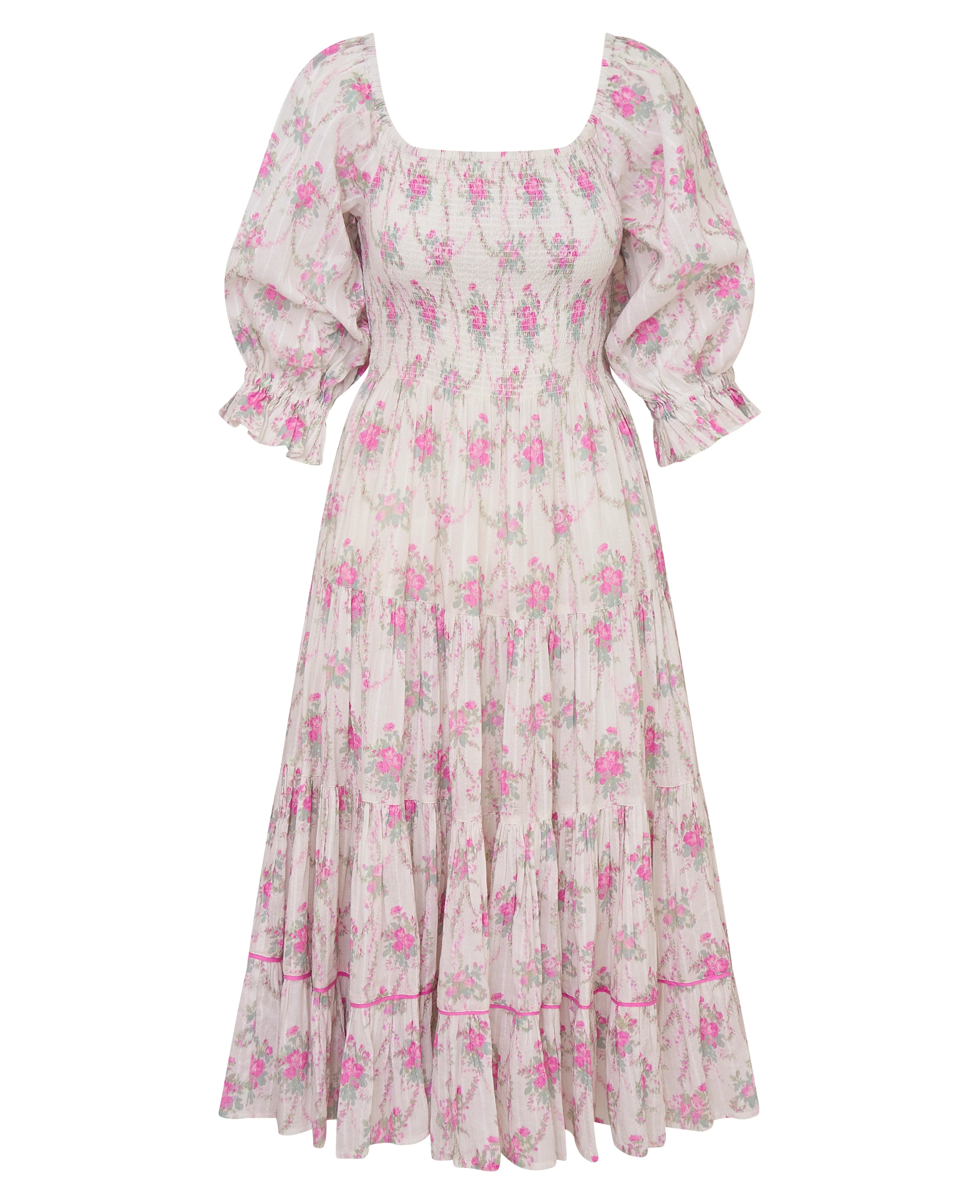 One of our original, beloved dresses returns with a pretty new print for the season. The Rigby Dress arrives with a flirty new floral all over. This sweepy midi dress features a dobby striped fabric for added texture, elastication at the sleeves so they can be worn on or off the shoulder, and a ruffle skirt that releases into shirred tiers.